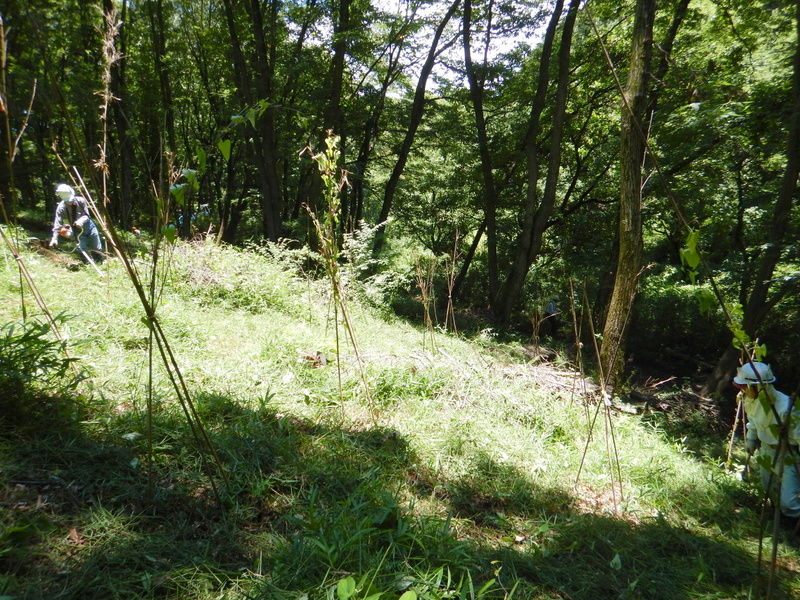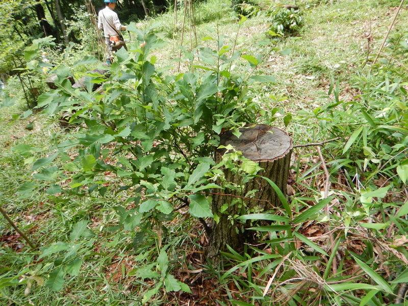 まわりの林床は刈払機を使って下草刈りをします。今年の1月25日に伐採したコナラとヤマザクラは萌芽していました。