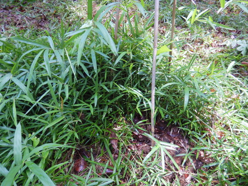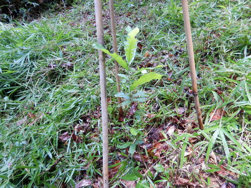 今日は、4月10日に植樹したコナラの実生の下草刈りをしました。苗木を覆っているアズマネザサを鎌やハサミで取り除き、苗の日当たりをよくします。アズマネザサを取り除いてみると、早くも枯れてしまっているものもありました。