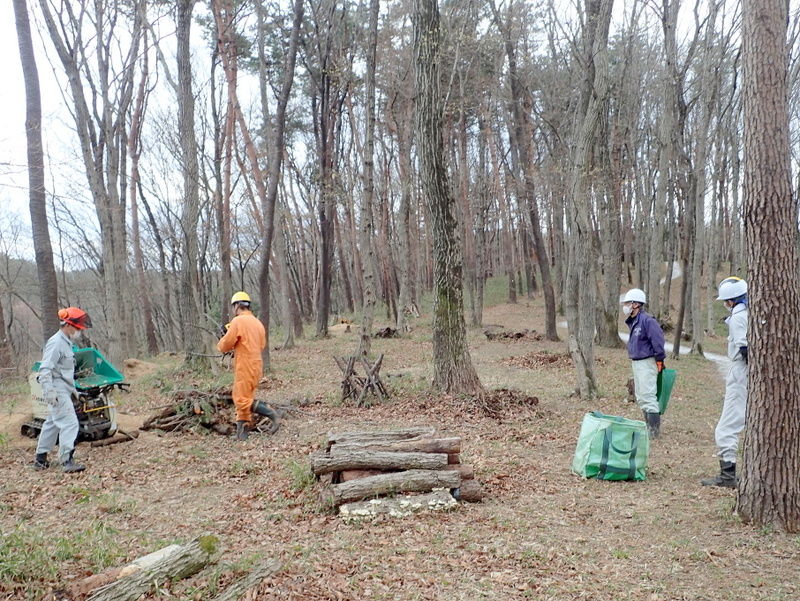 市民の森保全クラブの定例作業日です。出席者は、片桐さん、金子さん、澤田さん、細川さん、三本さん、鷲巣さん、峯岸さん、Hikizineと市職員の10名でした。市役所のウッドチッパーで作業エリアに積んである伐採木の枝条や、雪で折れた落枝を片づけました。チップの一部は堆肥箱に入れました。