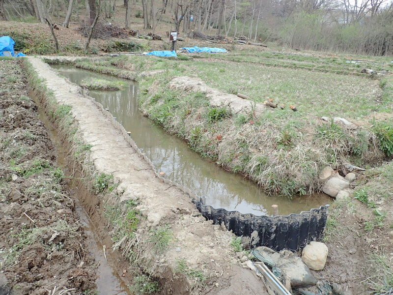 岩殿A地区の上の池の出口を畦板でふさいでいますが、池の水位は変わりません。