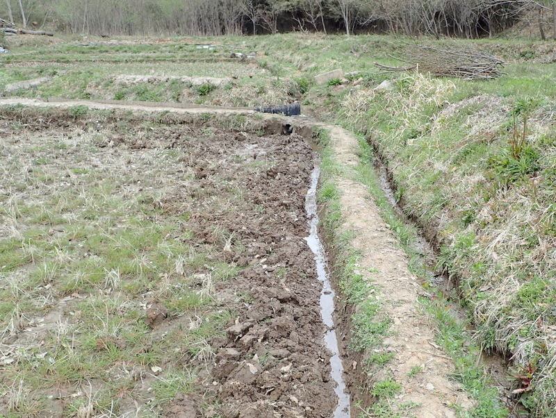 田んぼに漏水しているので田んぼの畦際に溝をほりました。