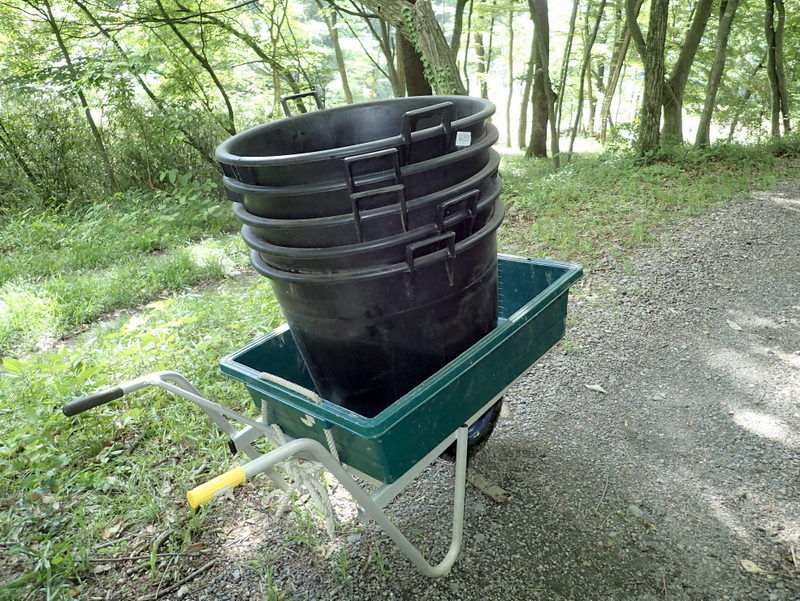 丸型の100リッターの容器7個に詰めて、はいりきれないものは容器の上に載せました。