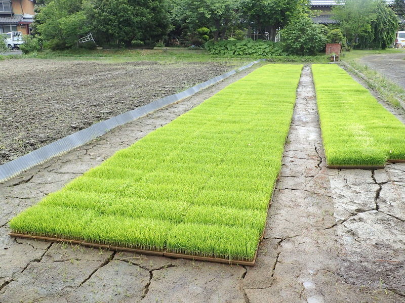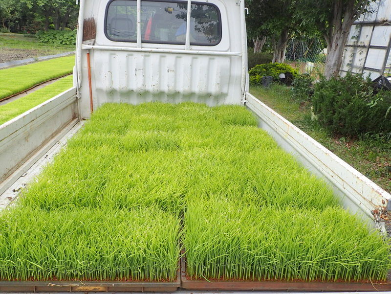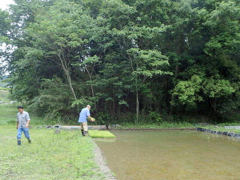山本さんのお世話で上押垂(かみおしだり)の農家に育ててもらっていたイネ苗を児沢に運び、上の手前の田んぼに置きました。25箱です。