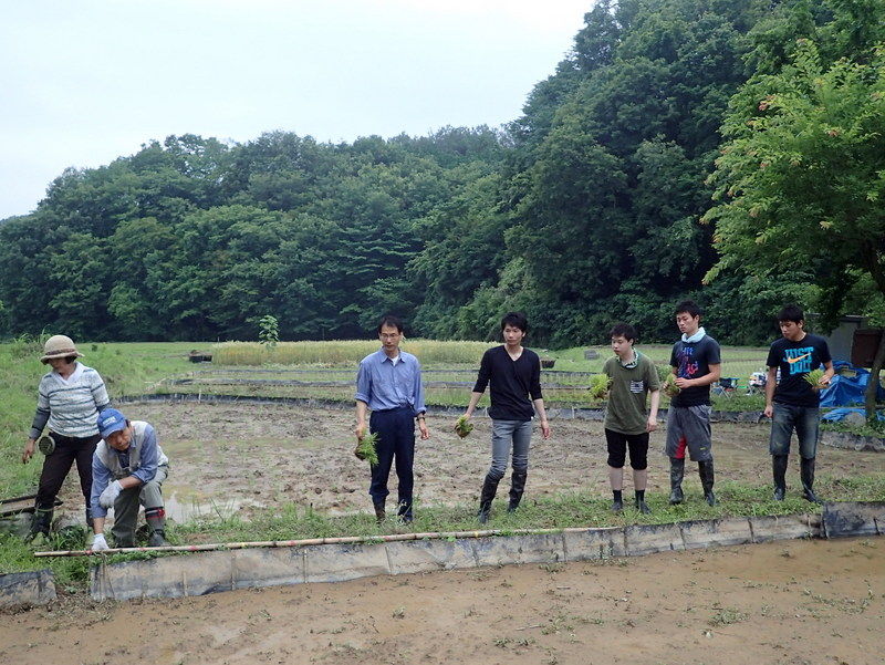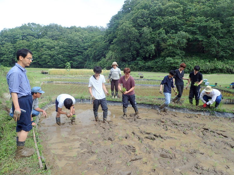 岩殿B地区で須田ゼミの田植え。下の田んぼは3年生6人、中の田んは4年生4人でコシヒカリを植えました。