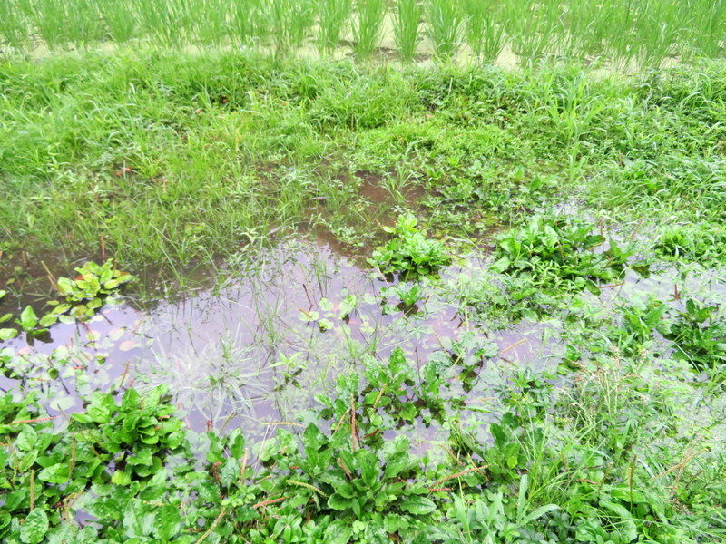 入梅後初のまとまった雨です。降雨量にはバラツキがあり東松山市・鳩山町では1日で20~40㎜程度です。児沢の田んぼ周辺は水が溢れていました。