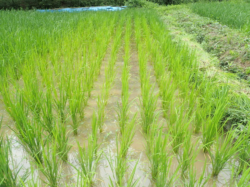 耕作放棄される前は2枚の田んぼだったところを1区画にしました。田んぼの高低を均しきれずに田植えしたので、北側と南側とでは水深が違います。田んぼの北~東側(苗の色がうすいところ)はすぐに耕盤といった感じで田んぼの土が硬く、西~南は長靴がズブズブと埋まるドブッ田です。