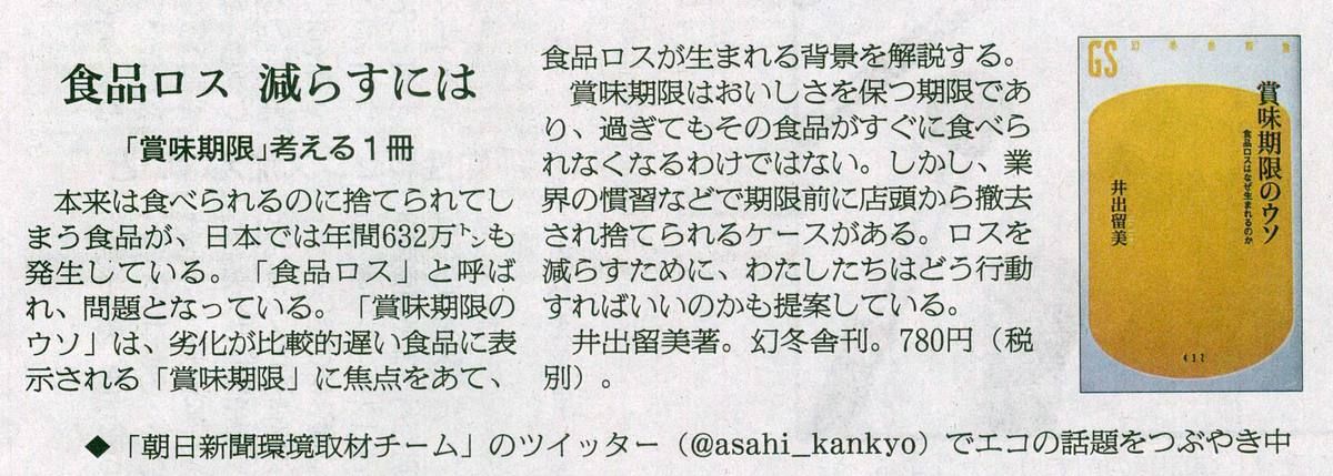 朝日新聞夕刊(2017年1月24日)環境面に『賞味期限のウソ 食品ロスはなぜ生まれるのか』(幻冬舎新書432、2016年10月)が紹介されています。