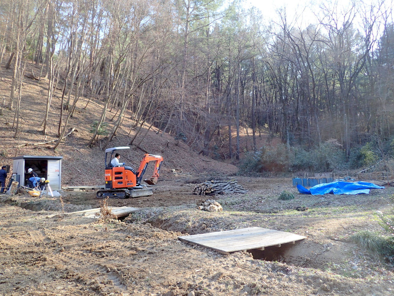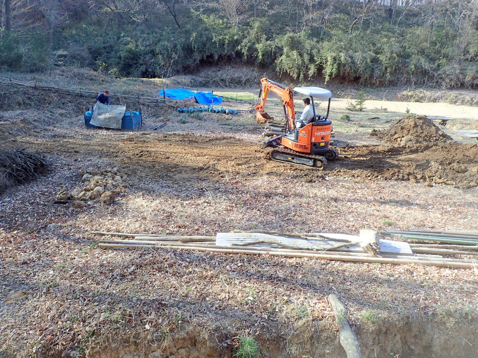岩殿C地区の奥、ボッシュ林側の区画に積みあげていた丸太や枝を、ユンボで掘った溝に埋めました。