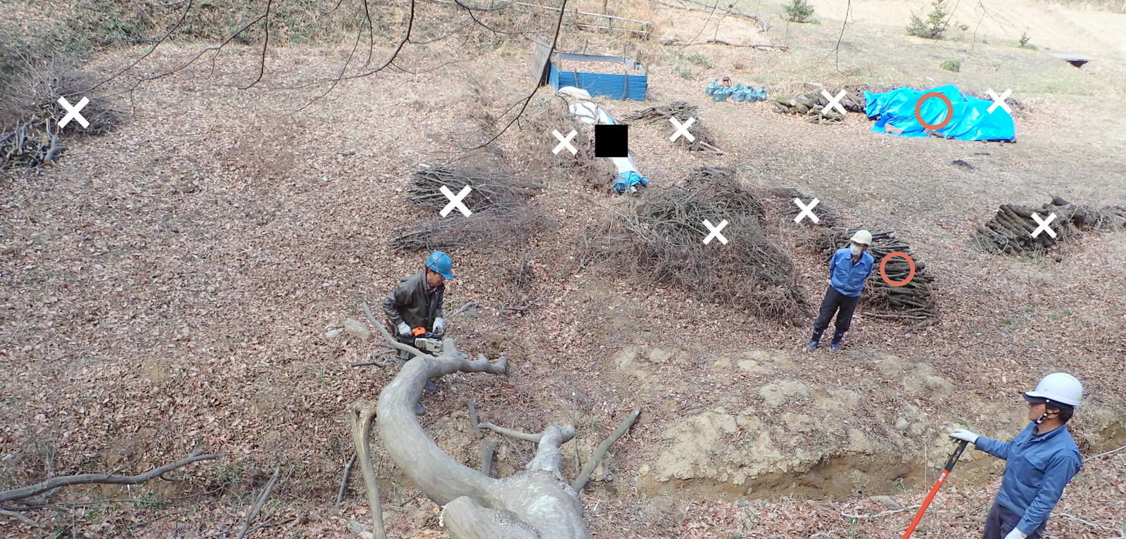 ■の稲架棒は他所に仮置きし、を付けたものはそのまま現場に残し、×の丸太や枝は土中に埋めました。