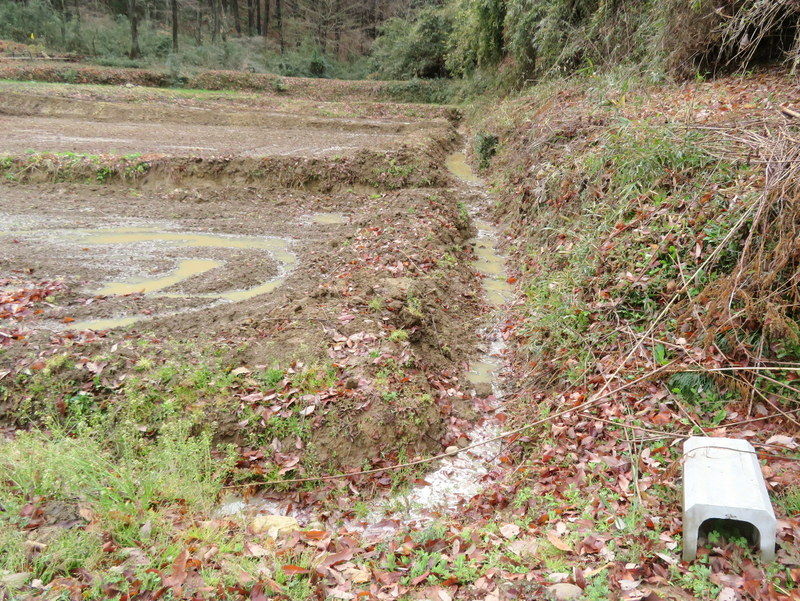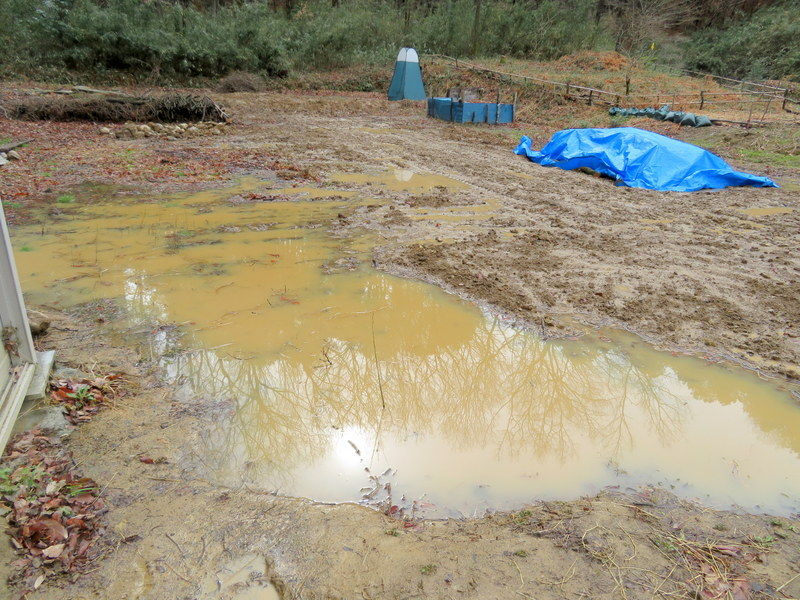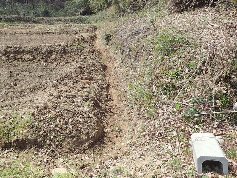 雨が降り、どこに水がたまるのか見えてきたので、3月16日18日にユンボで作業をした岩殿C地区の手直しを始めました。無名沼イ号から市民の森に沿って降ってくる水路の高低を調節し、奥の物置前に排水用の溝を掘りました。
