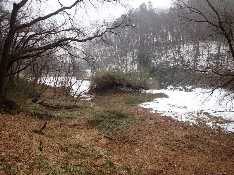 今日も笹藪刈りをしました。刈込みがすすんで藪のすき間から後の田んぼの積雪がみえるようになりました。