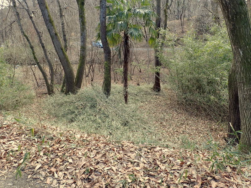 入山沼の堤下の耕作放棄地は岩殿1397です。須田さんが、岩殿1397におおいかぶさって繁茂している堤と道下の斜面の笹を刈り払いました。