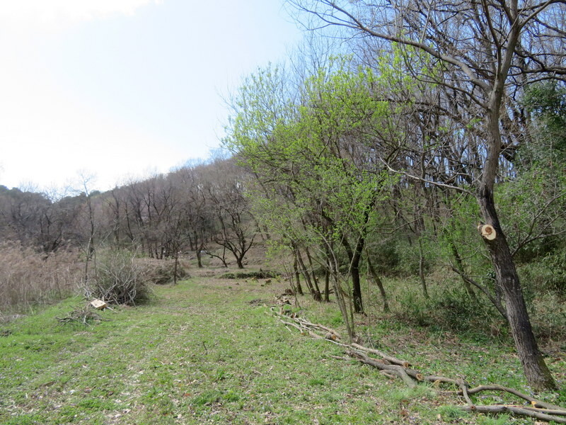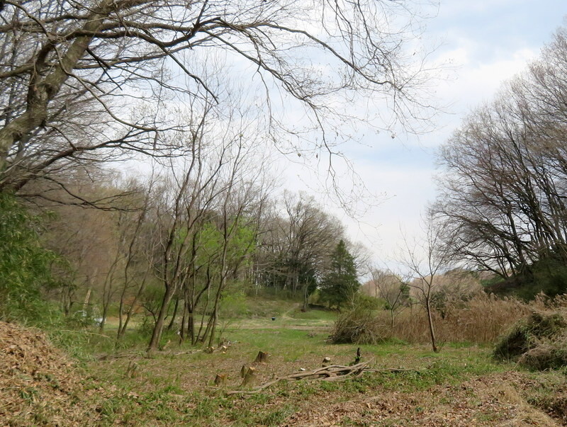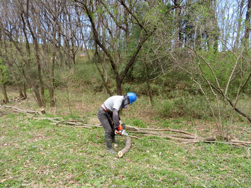 岩殿D地区の上を通る入山沼に向かう道路から岩殿H地区の奥にあるG地区と市民の森作業道が見通せるように眺めをよくするため、H地区で今回伐採せずに残した低木の幹切りや枝払いを新井さんがしました。今年の冬にはG地区のヤナギの高木は皆伐します。