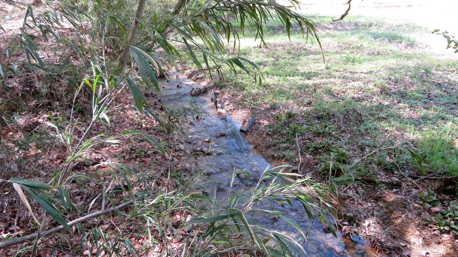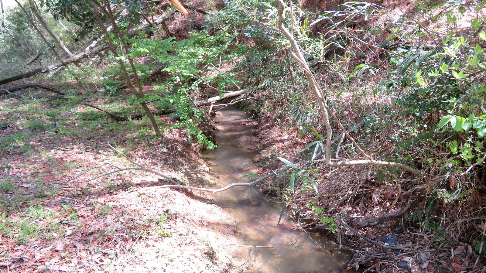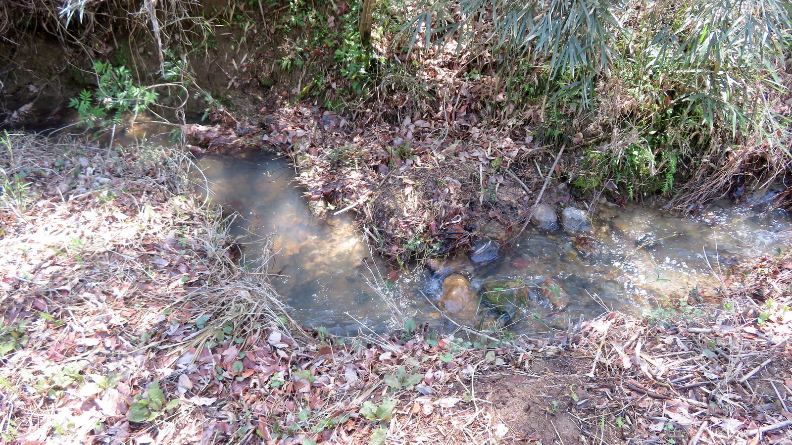 入山谷津(岩殿F・G地区)のボッシュ林境界沿いに流れる九十九川源流。