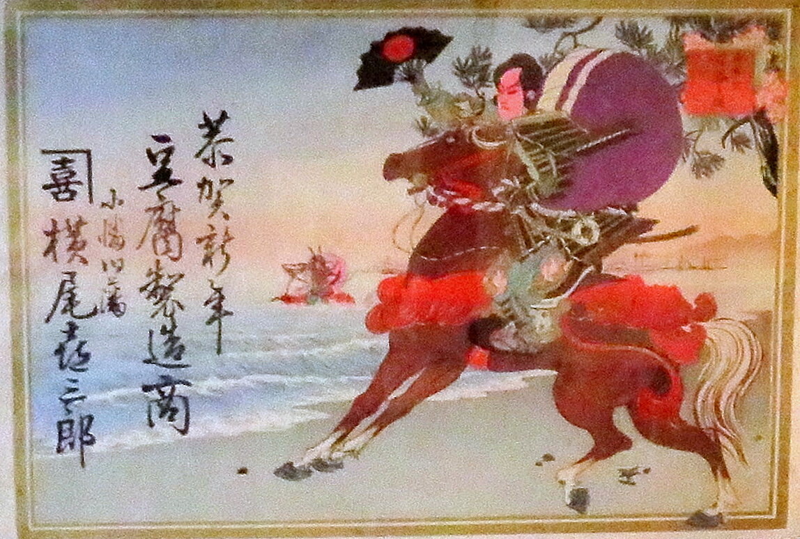 甘楽町歴史民俗資料館別館(有賀茶店の蔵)に展示されている明治期の引き札(広告チラシ、石版彩色刷り)。