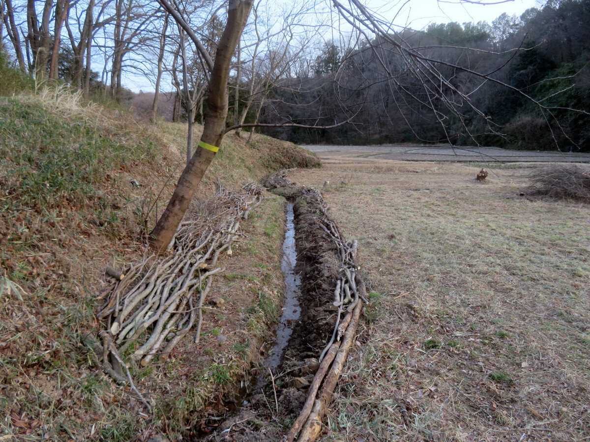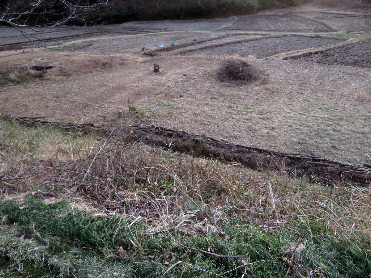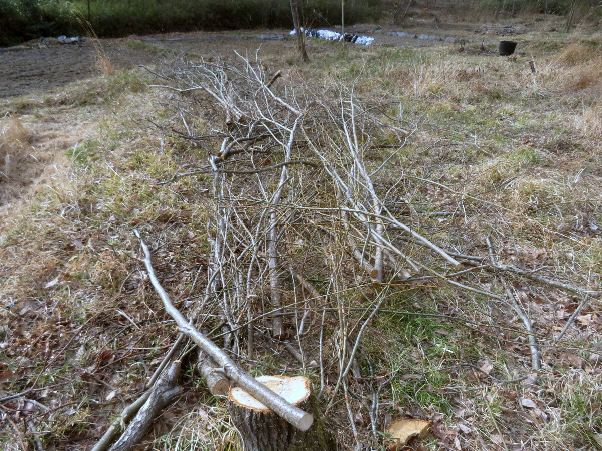 岩殿D地区中段に放置していた伐採木の条枝などを集め、ハンマーナイフモアで枯草刈りができるように下段に片づけました。