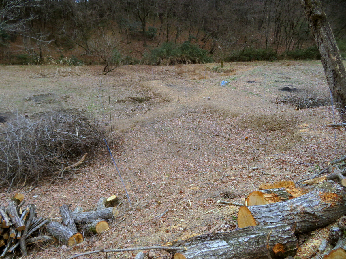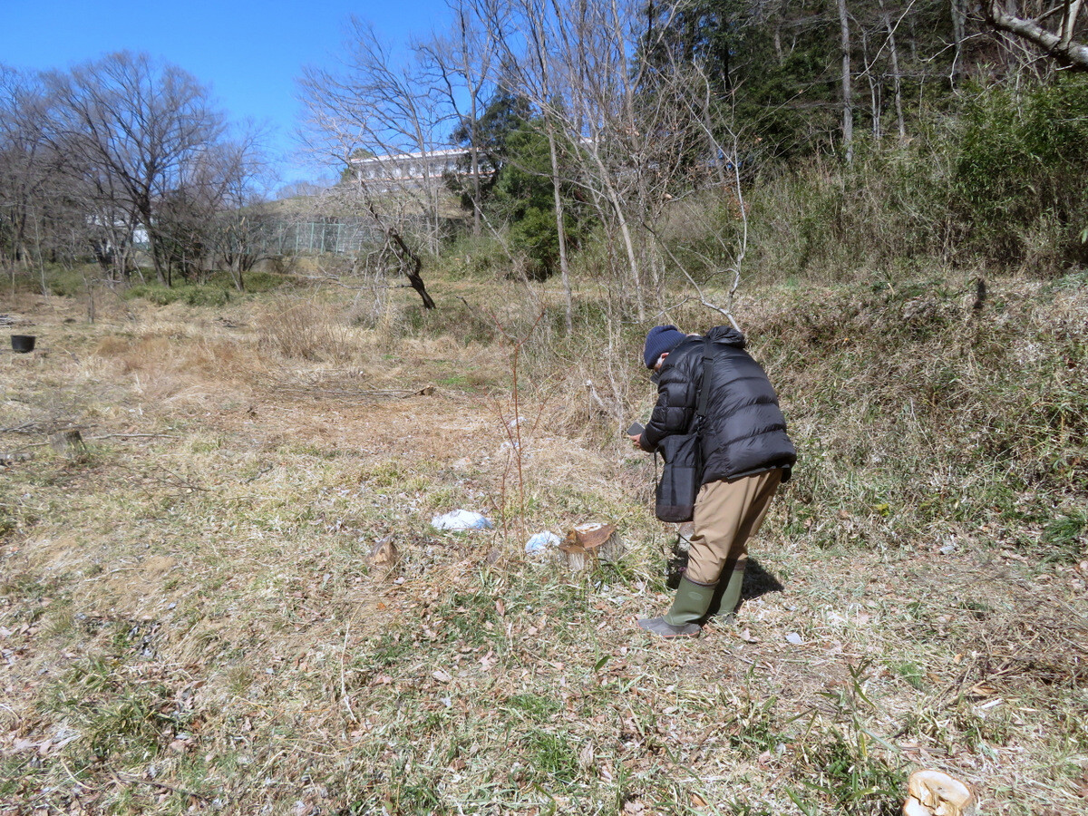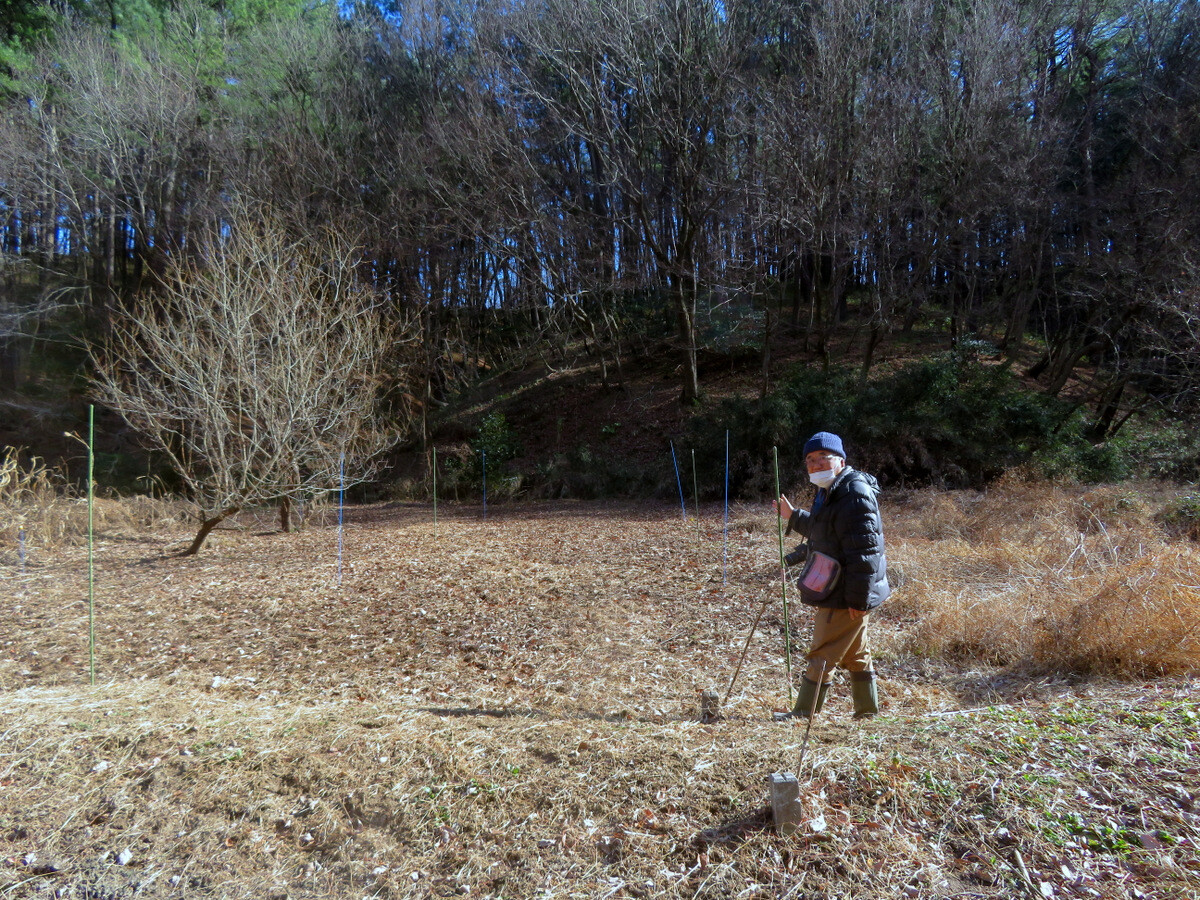 新型コロナウィルスの感染拡大に伴い発令された2回目の緊急事態宣言が継続する中、岩殿F地区の植物調査枠(5m×5m)のポールを再設定して調査再開です。12月に調査枠内の草刈りをして枠外に移動して焼却したので、一見何も生えていないように見えますが、カナムグラ、ケキツネノボタン、ミゾソバなどすでに出芽しています。