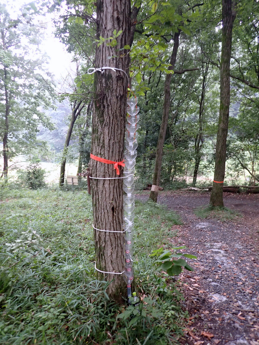 木の周りをホバリングしながら飛んでカシナガがトラップに衝突し、ペットボトルにぶつかりながら脱出できずに、下の黒いテープで覆われた捕獲部まで落ち、正の走光性があるので、となりの明るいペットボトルに飛んで、エタノール(or 石鹸水)を入れた水におちて死亡します!