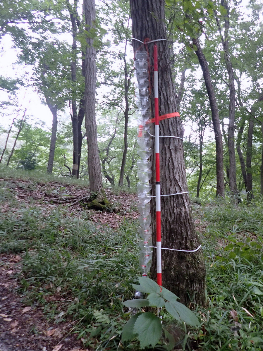 鳥取さんが作製したペットボットルのカシナガ捕獲トラップの試作品が完成。トラップを市民の森尾根道入口付近のコナラに取り付けました。