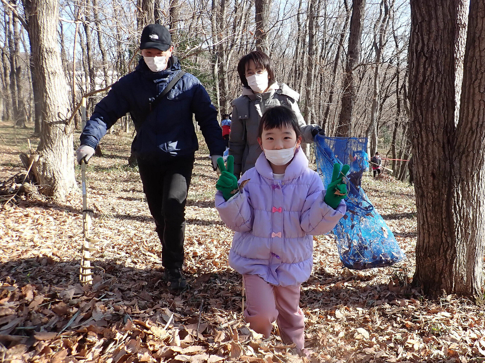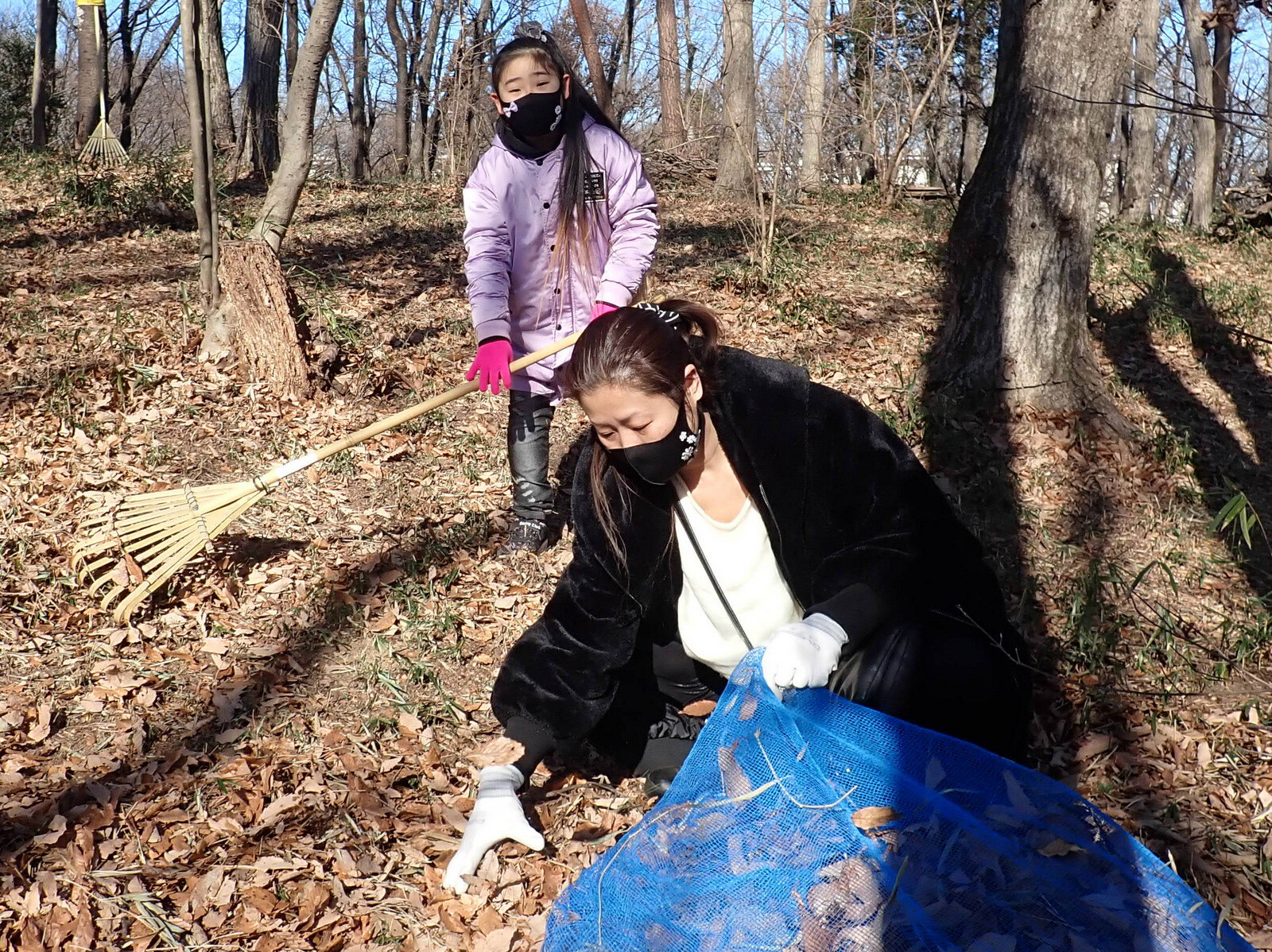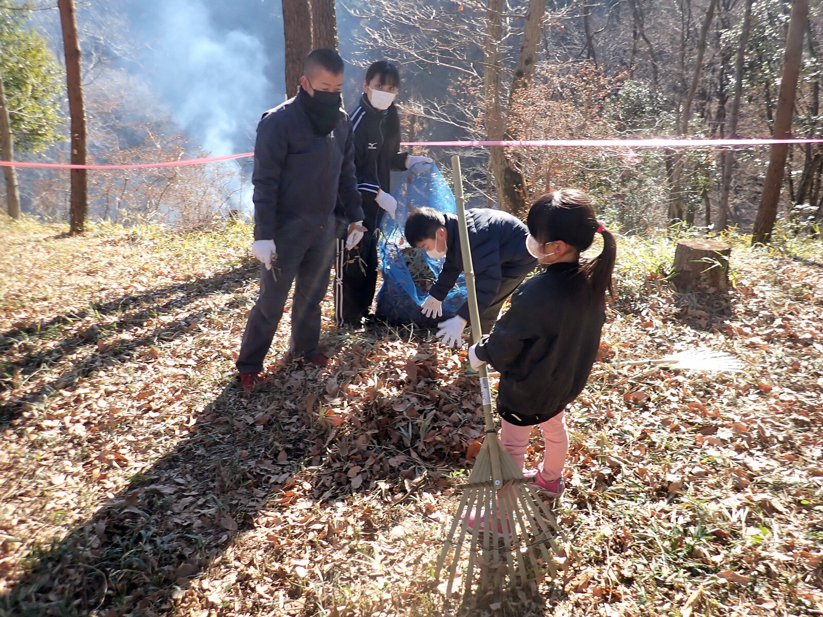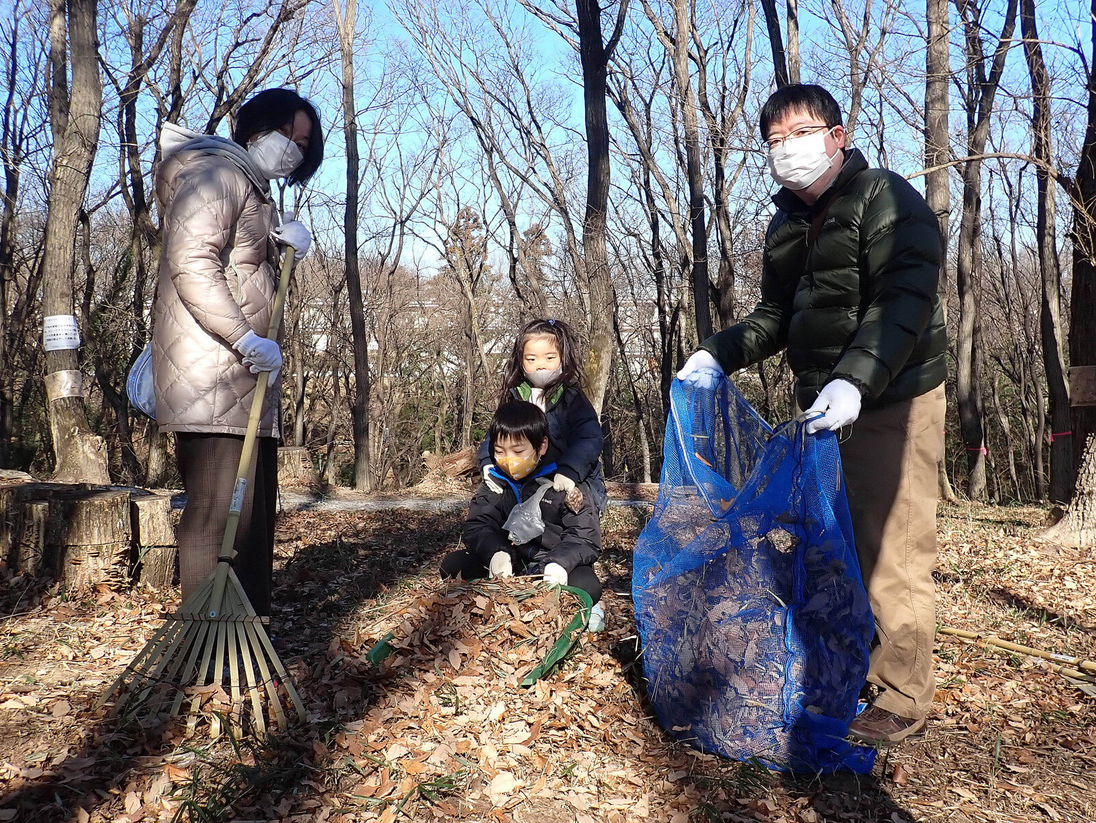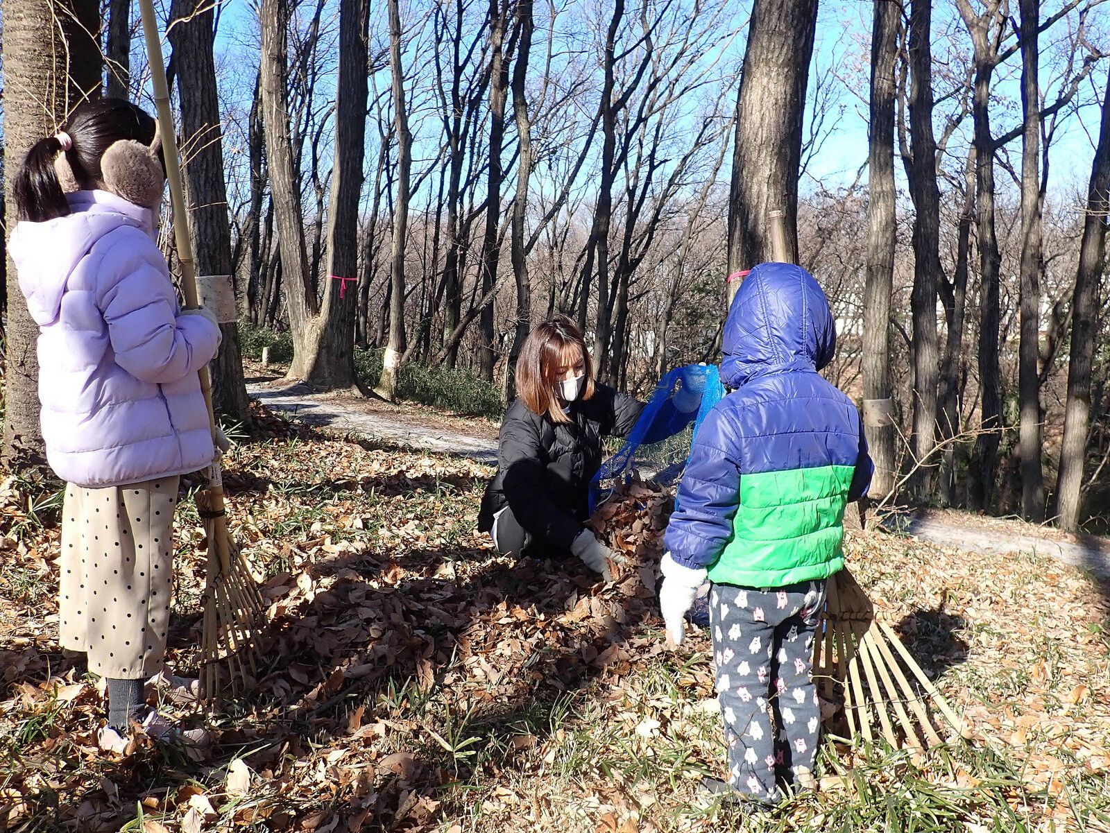 1月8日に実施した『市民の森で落ち葉を掃いて焼き芋を食べよう』(市民の森保全クラブ・岩殿満喫クラブ共催)写真集(その1)落ち葉掃きです。