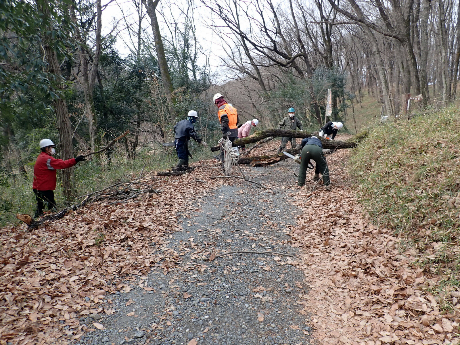 市民の森保全クラブ日曜日の活動日。参加者は芦田さん、新井さん、江原さん、金子さん、木庭さん、鳥取さん、細川さん、鷲巣さん、渡部さん、Hikizineの10名でした。今日からナラ枯れ枯死木の伐採を始めます。今日は作業道から尾根の道上がり口近くのコナラ(枯死№14、フラス№6、目通り直径37㎝)です。