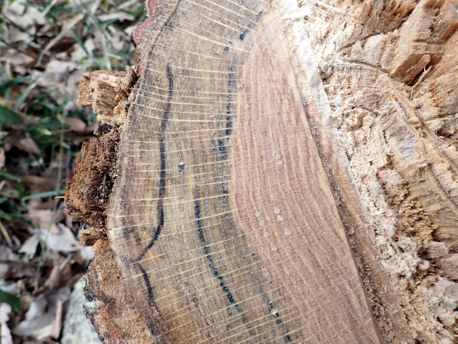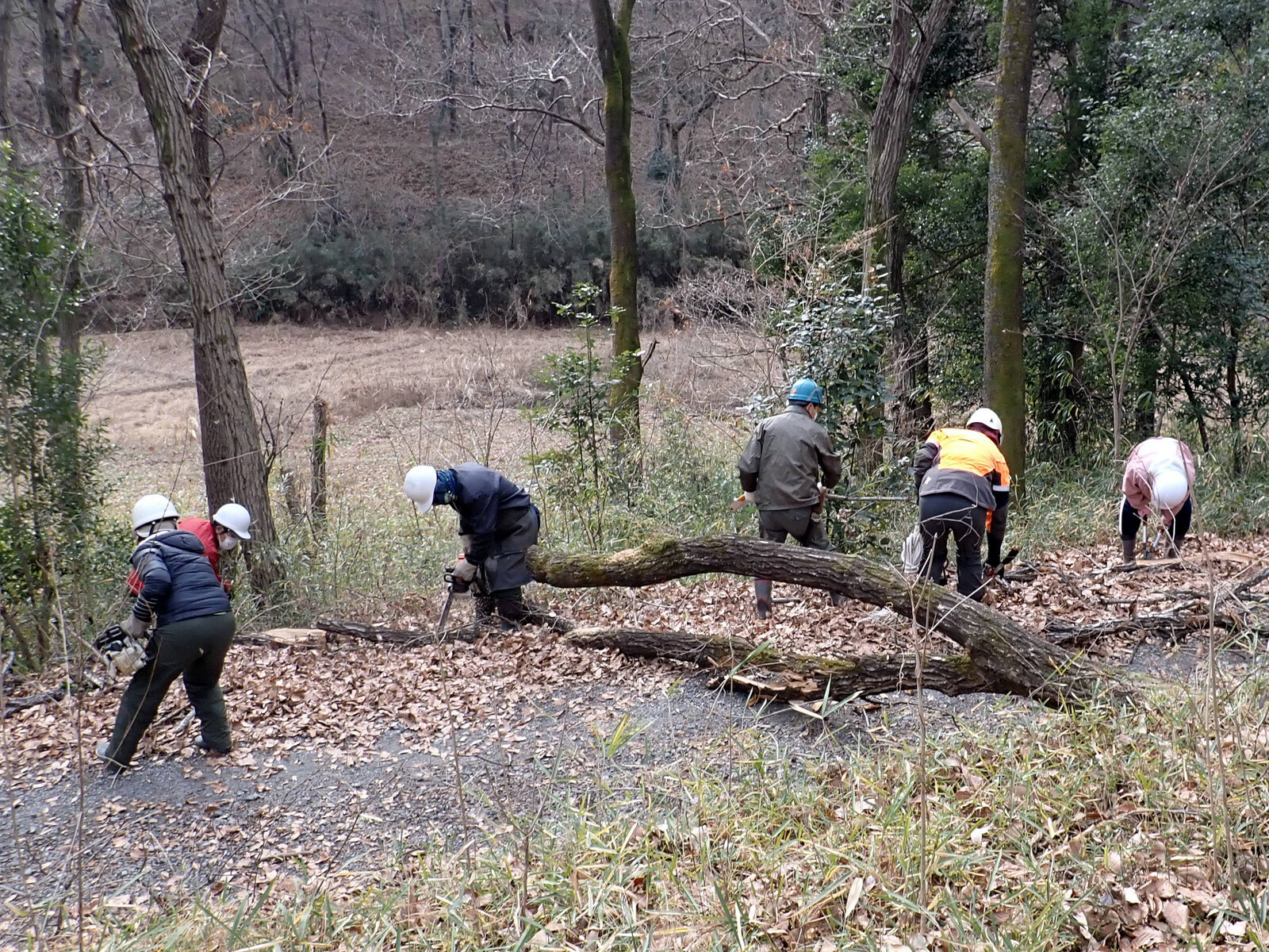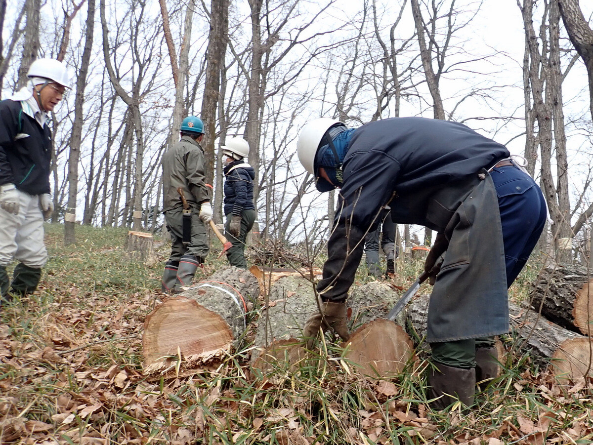 そこで、カシノナガキクイムシが幼虫である状態の時、枯死木を伐採して薪状に割材することにより、ラファエレア菌の増殖を抑えて幼虫が死んで行くと同時に、周辺のアリ(蟻)類による食餌行動による駆除を実施しました。