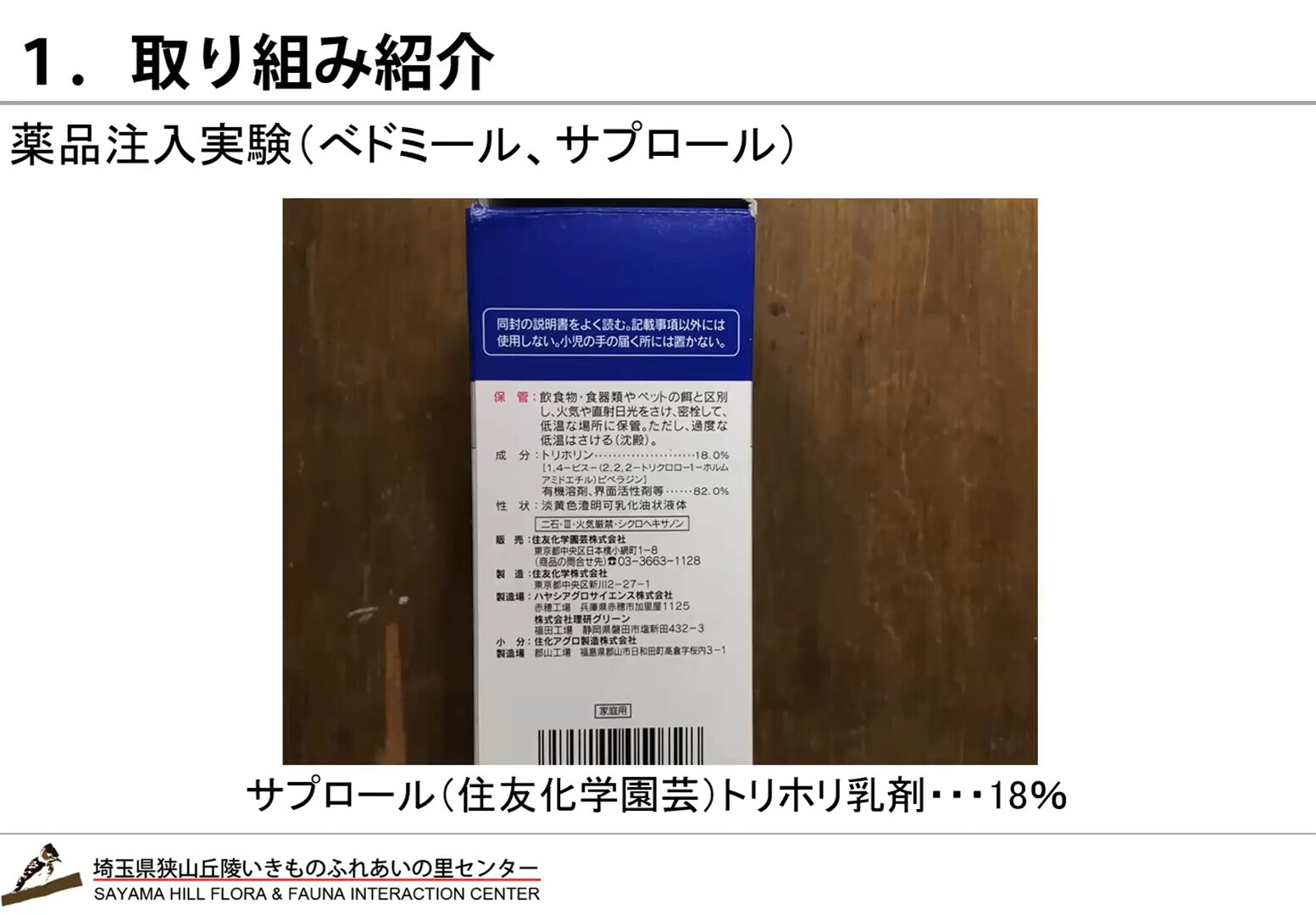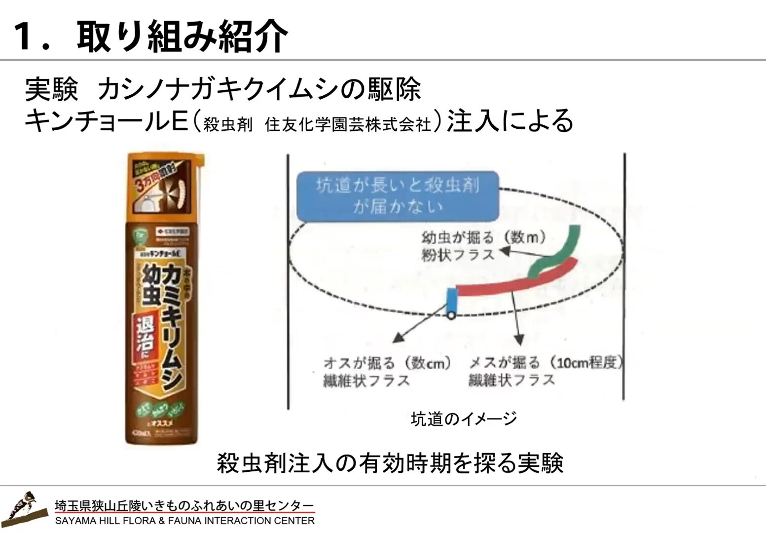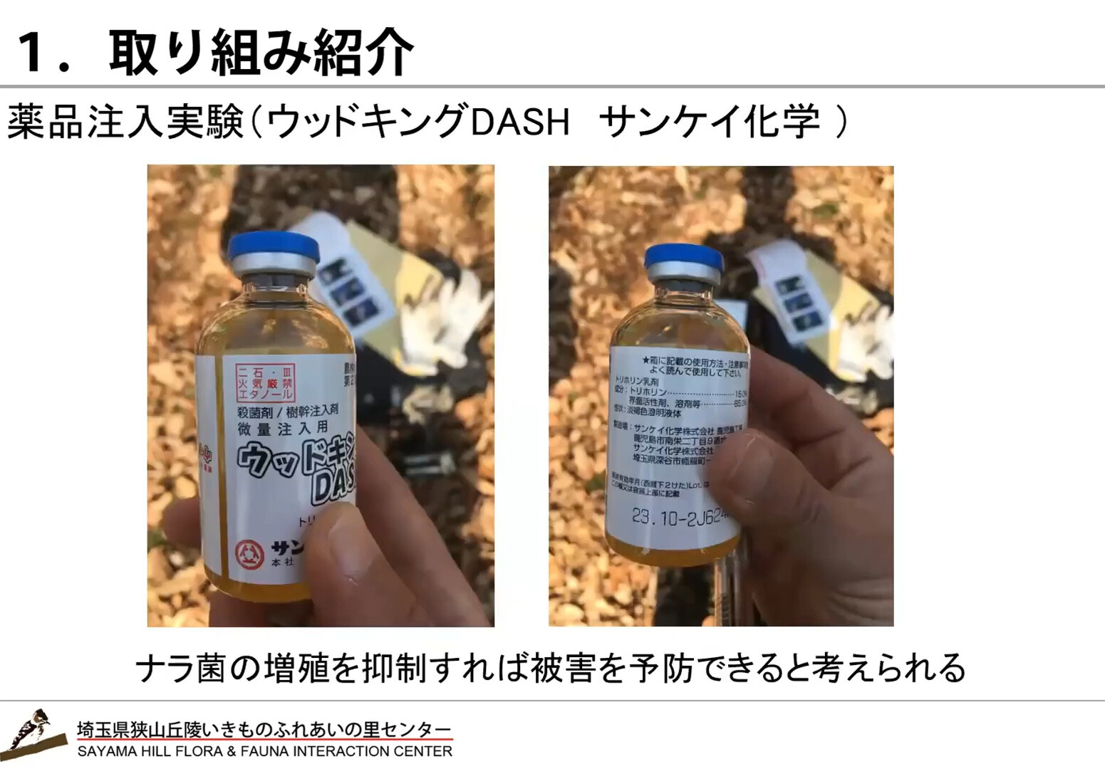 2月26日に狭山丘陵いきものふれあいの里センターと西武・狭山丘陵パートナーズが共催した「ナラ枯れ」をテーマにしたセミナーの報告が狭山3公園だより(狭山公園・八国山緑地・東大和公園)に『皆さんの疑問にお答え! 木の病気 ナラ枯れセミナー』動画として掲載され、セミナーの様子は3テーマに分けて、YouTubeで配信されています。①ナラ枯れって なに?、②狭山丘陵の雑木林とこれから、③質疑応答&対策事例の紹介です。③では14:00から「いきものふれあいの里でのナラ枯れ対策」があります。キンチョールEを使ったカシノナガキクイムシの駆除実験を行っています。「樹幹注入」です。