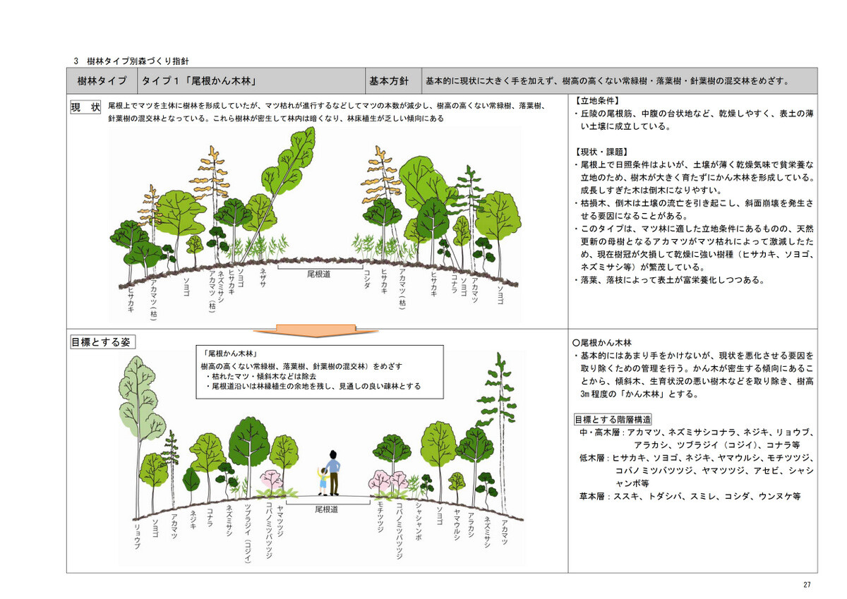 樹林タイプ1 尾根かん木林:基本的に現状に大きく手を加えず、樹高の高くない常緑樹・落葉樹・針葉樹の混交林をめざす
