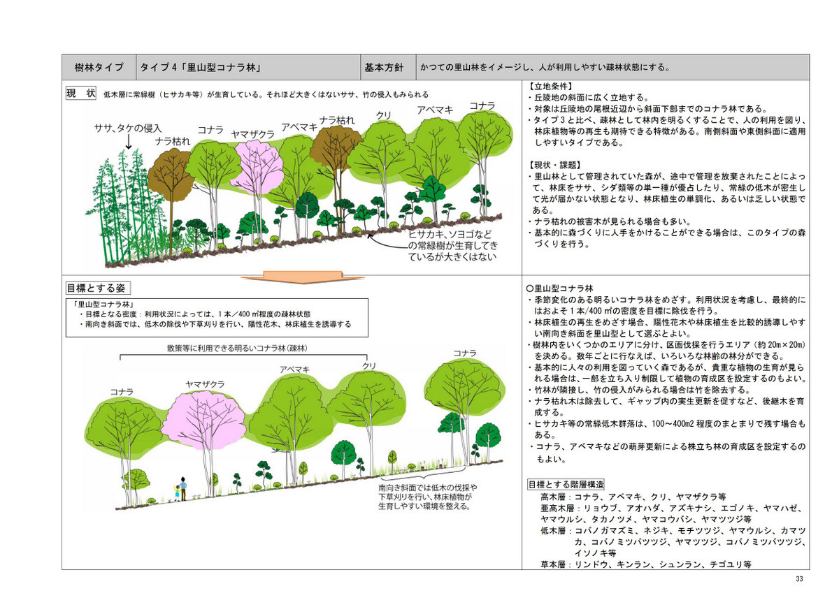 樹林タイプ4 里山型コナラ林:かつての里山林をイメージし、人が利用しやすい疎林状態にする。