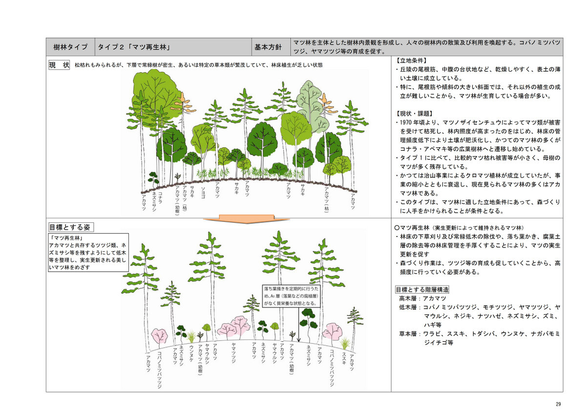 樹林タイプ2 マツ再生林:マツ林を主体とした樹林内景観を形成し、人々の樹林内の散策及び利用を喚起する。コバノミツバツツジ、ヤマツツジ等の育成を促す。