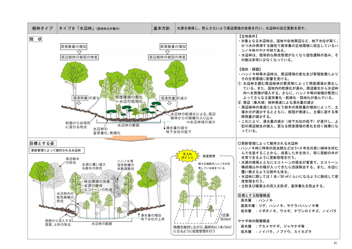 樹林タイプ8 水辺林:水源を確保し、荒らさないよう周辺環境の改善を行い、水辺林の自己更新を促す。