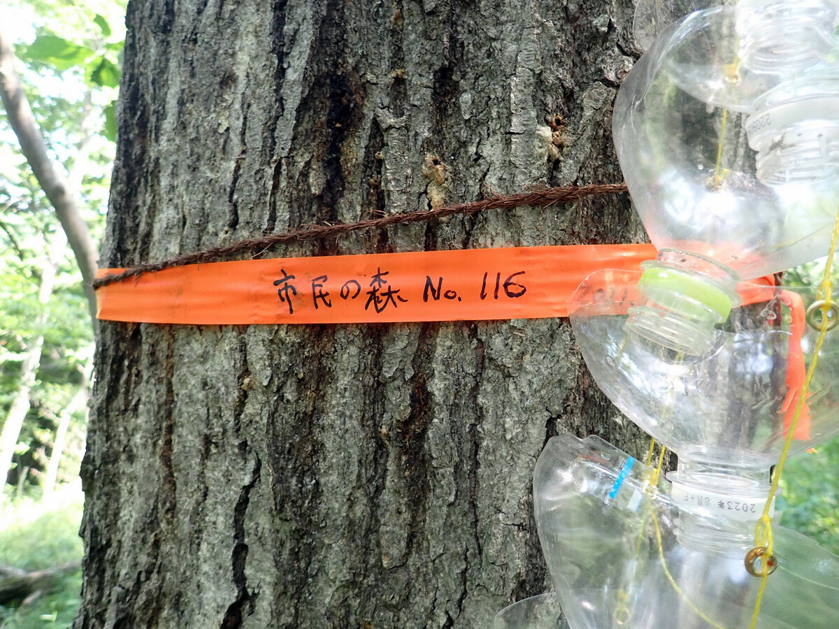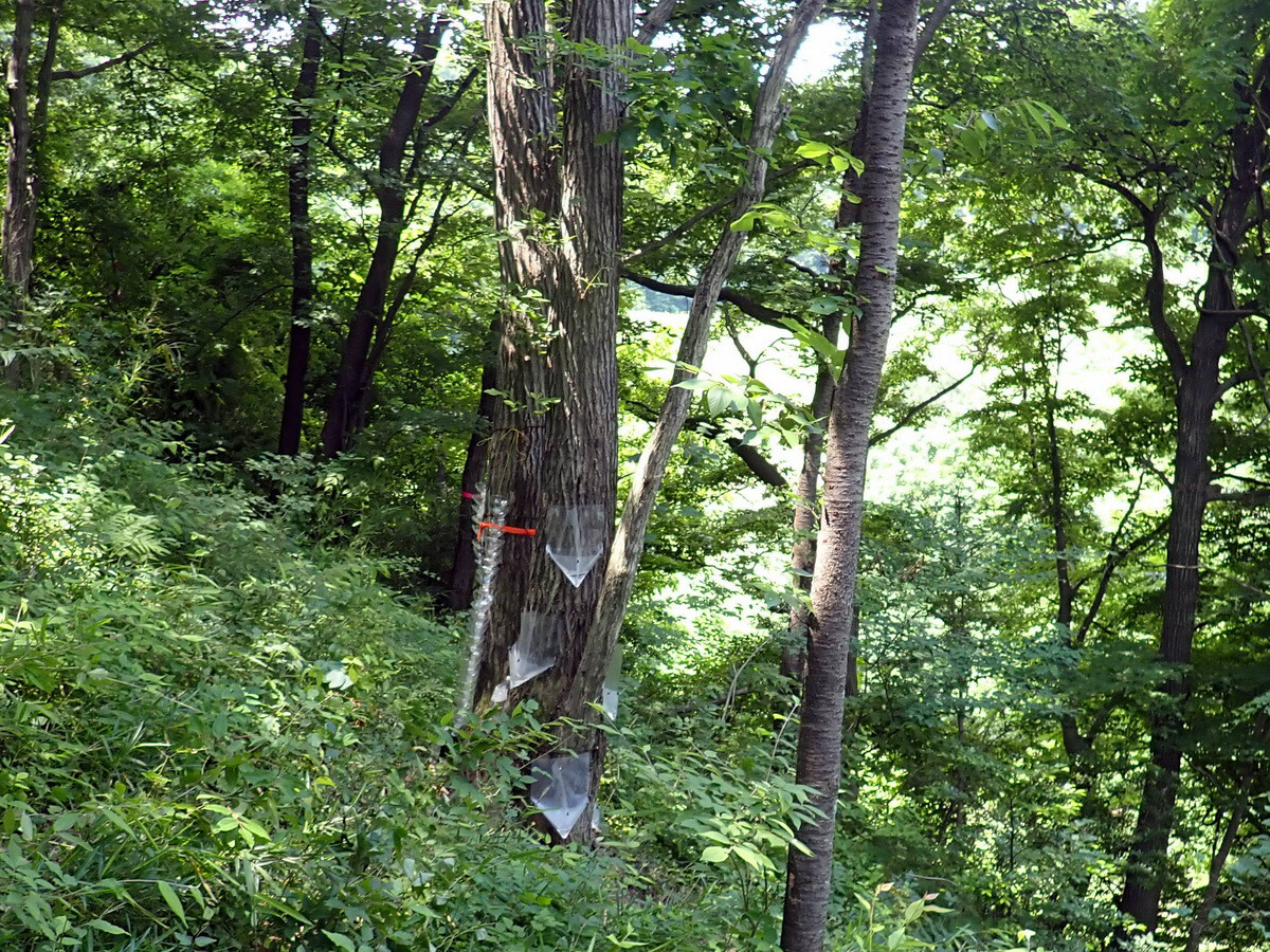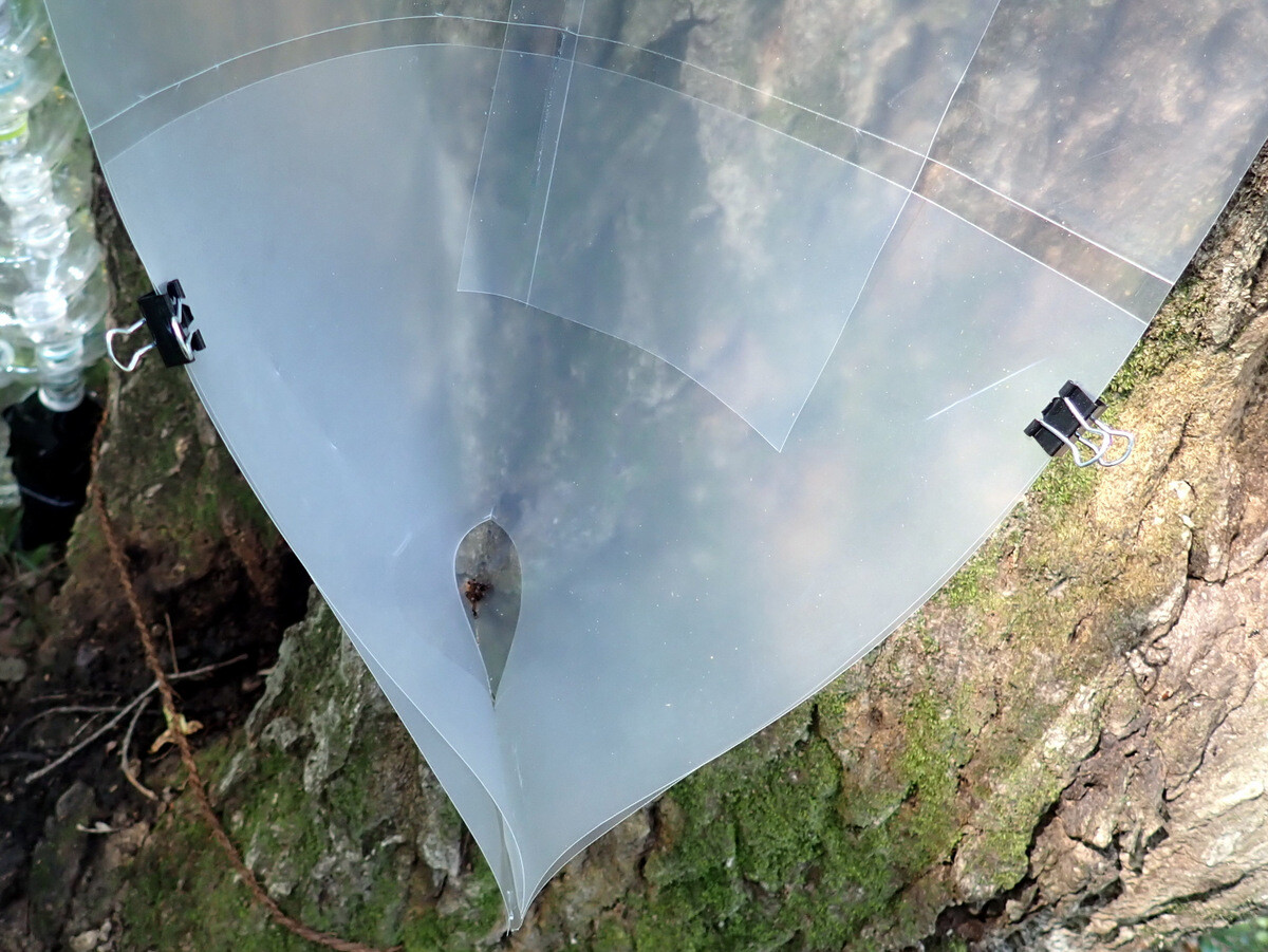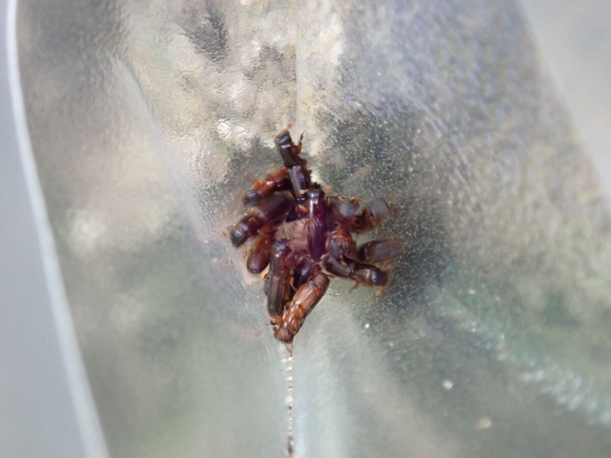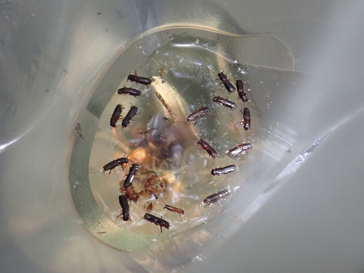 市民の森峠の道の21年度コナラフラス木(№116)に仮設置したクリアファイルトラップの捕虫部に落ちたカシノナガキクイムシ成虫です。カバーをつけていない(石鹸水をいれていない)ので生きています。