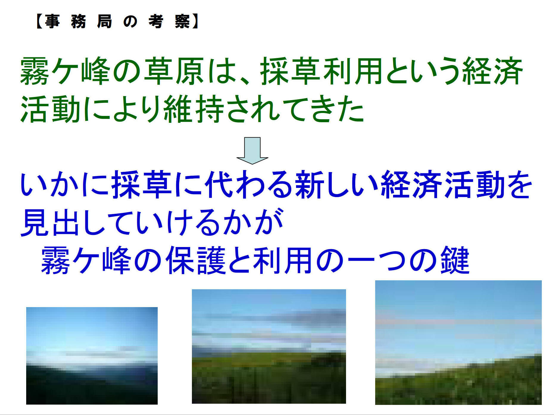 近年、県や市町村、NPO等により草原を保全する取組みが行われつつあるが、草原と山麓集落との関わりの変遷を把握することは、今後の草原保全に多くの示唆を与えてくれると考えられる。
