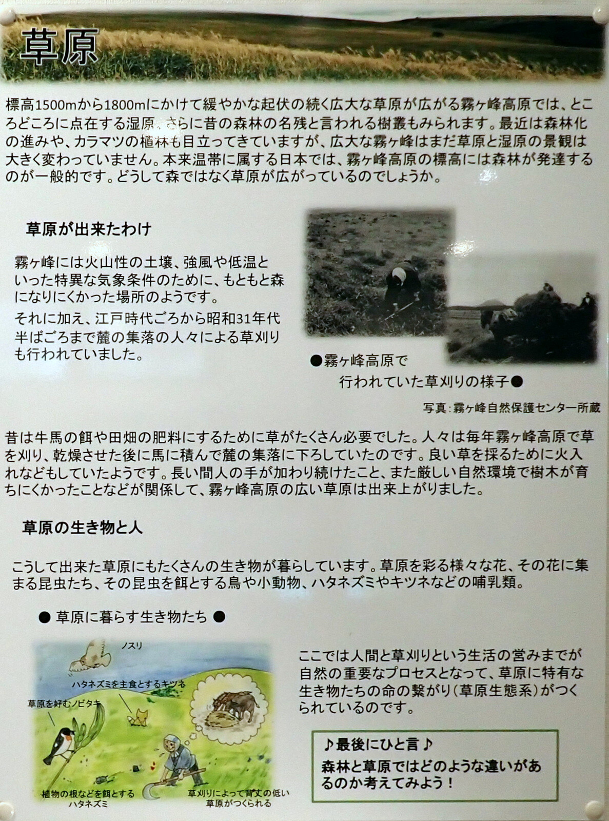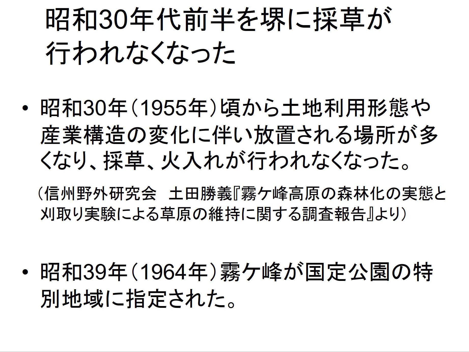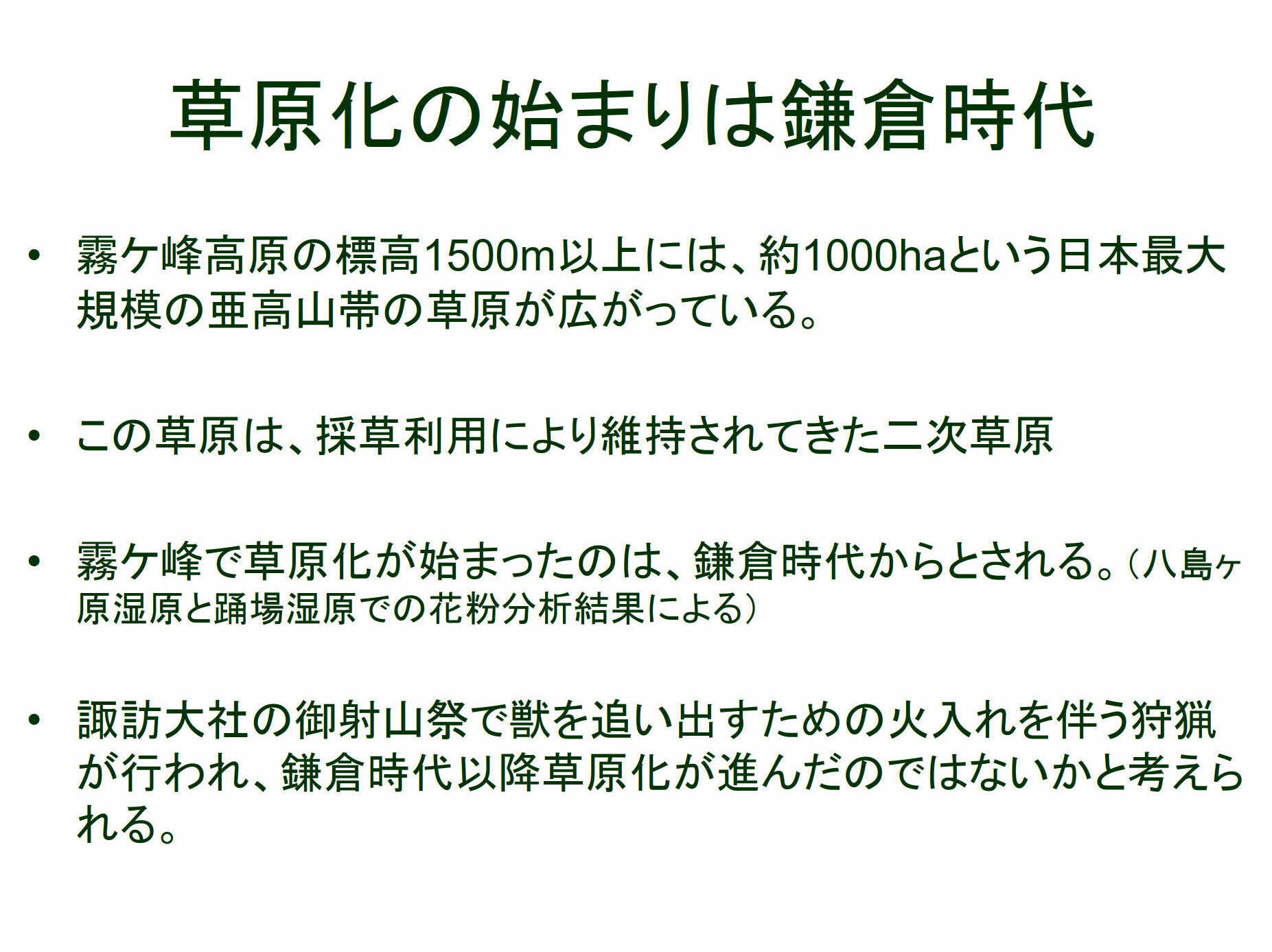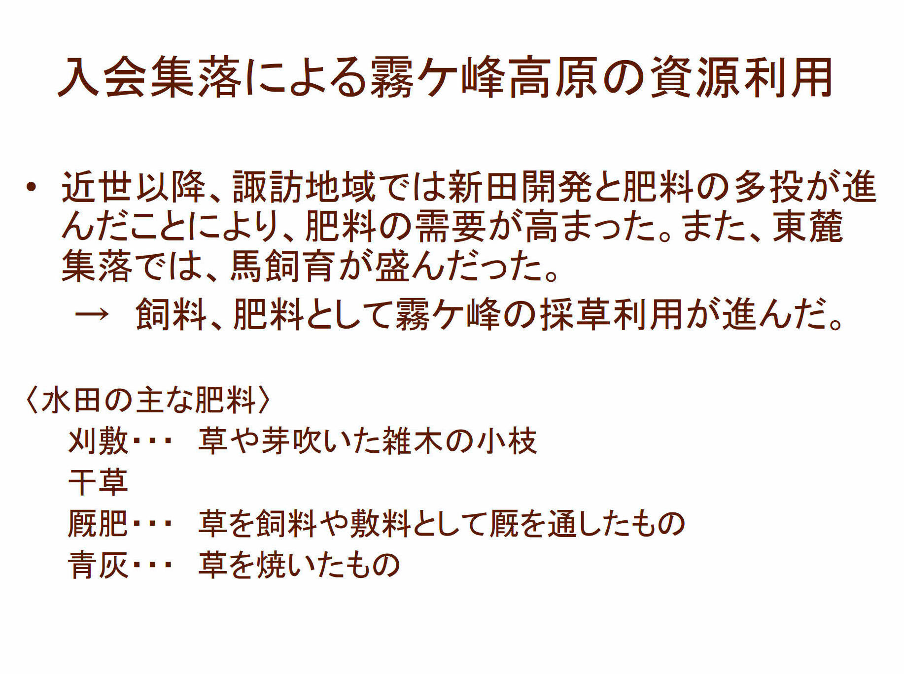 これまで霧ヶ峰高原の草原と山麓集落との関わりについては、草原化の起源が鎌倉時代であること、近世以降霧ヶ峰高原は肥料や飼料となる草の採取に利用され近世末には全域が草原となり、明治以降化学肥料の普及により採草利用が減少し草原の縮小が始まったこと、昭和初期には標高1500m以上は秣の採取に利用されていたこと、昭和初期の秣の具体的な採取方法等が解明されてきた。