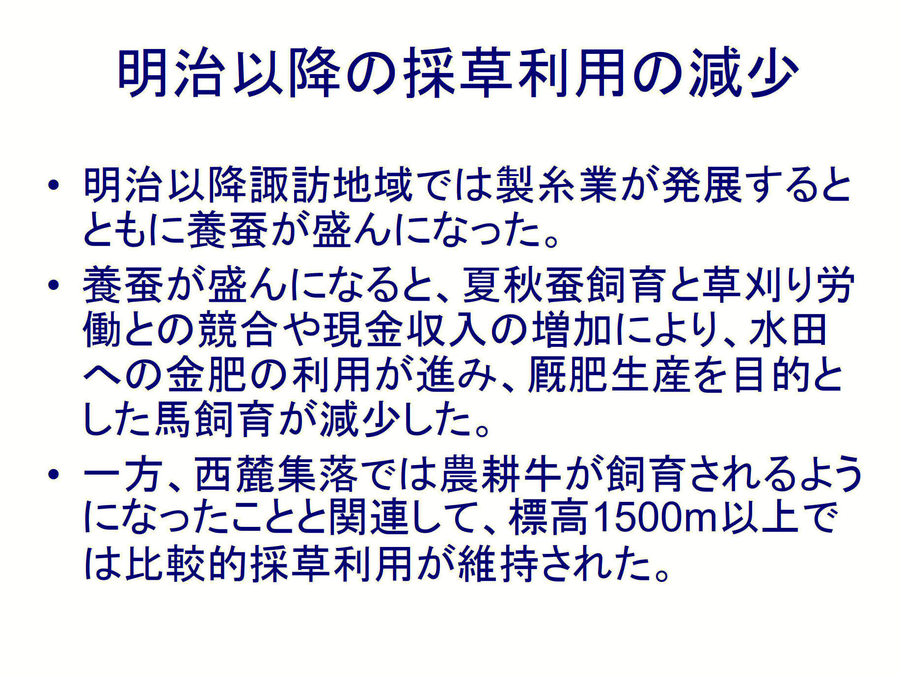 6. おわりにこれらから、近世末に霧ヶ峰高原全域が採草地として利用されたのは、山麓集落が稲作を中心とした生業を営み肥料をほとんど自給していたためであったと考えられる。また、明治以降の採草利用の減少は、養蚕が盛んになり現金収入が増加するとともに肥料としての草の価値が低下したためであったと考えられる。一方、明治以降も標高1500m以上で比較的採草利用が維持されたのは、西麓集落が現金収入を得るために酪農を開始したことと関連していたと考えられる。利用規制の運用状況の変化は、こうした生業の変化に伴う草の資源価値の変化を反映していると考えられる。