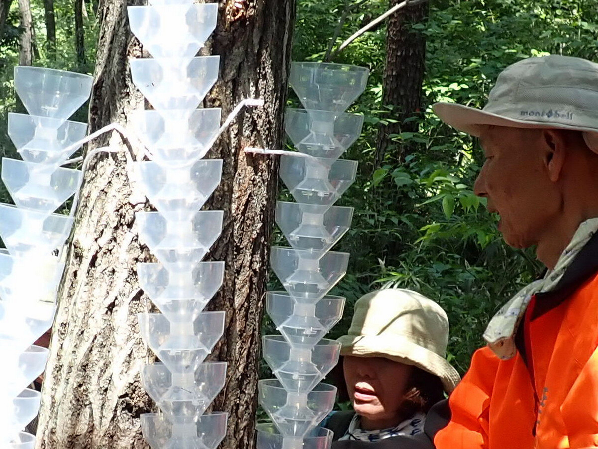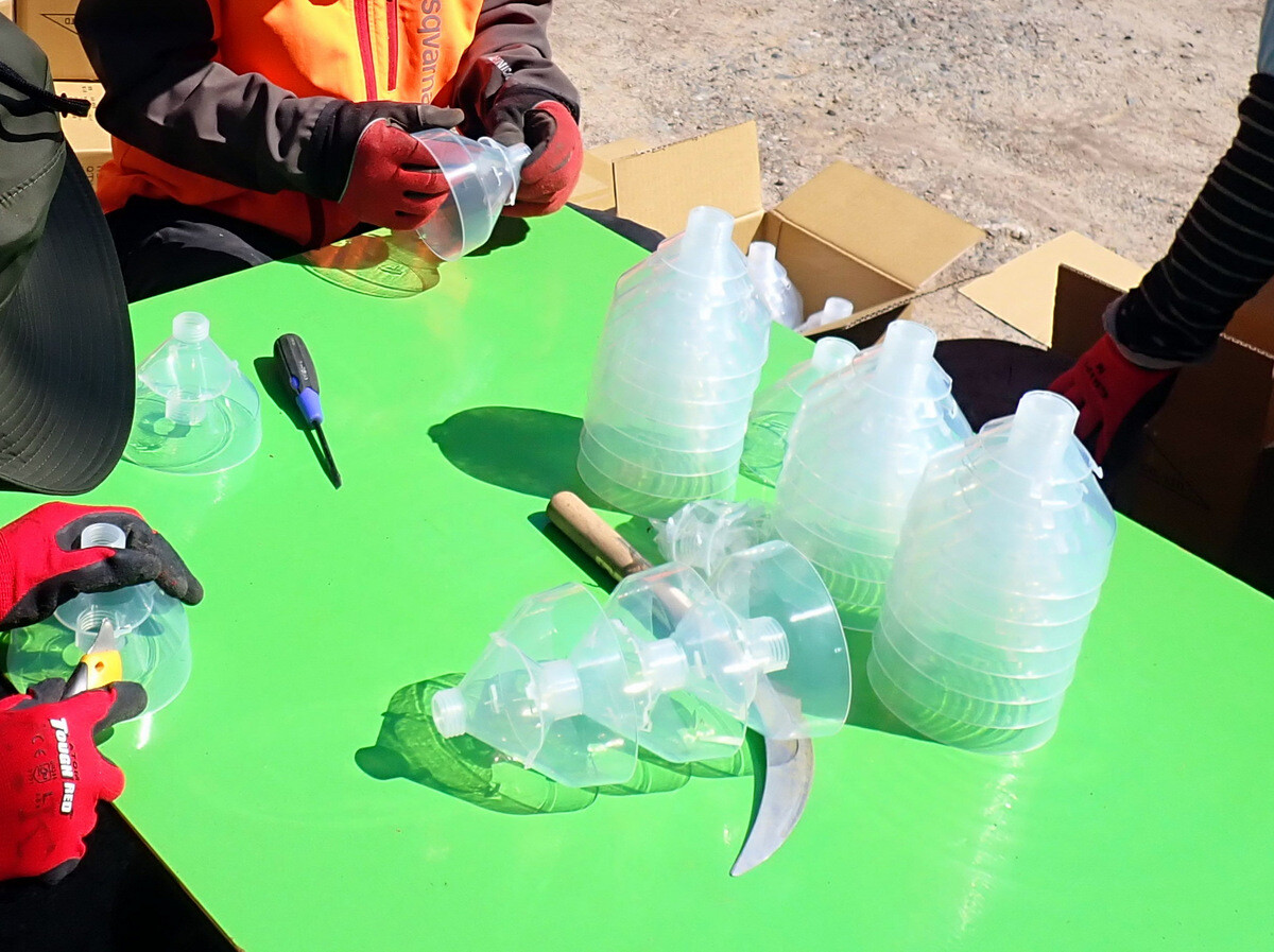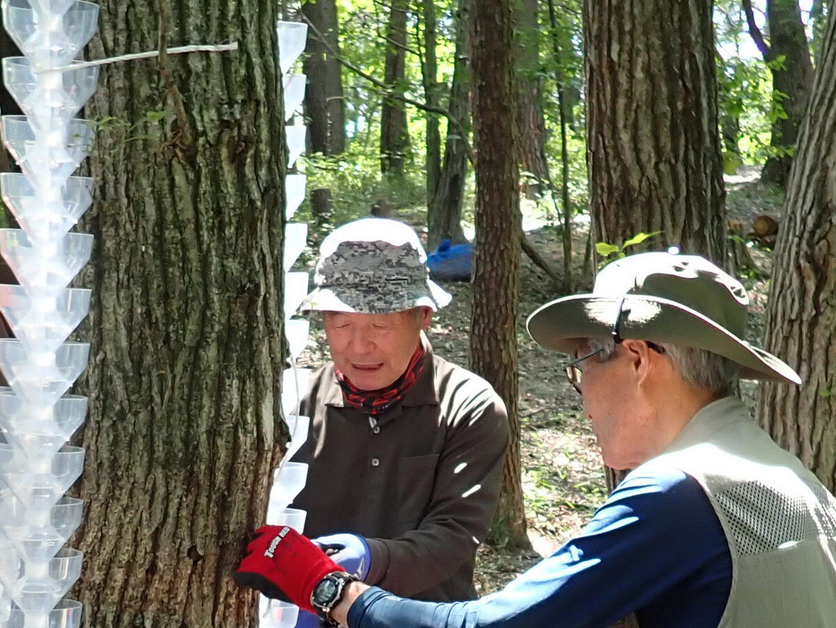 市民の森追加作業日。参加者は江原さん、木谷さん、鳥取さん、細川さんとHikizineの5名。尾根の道でトラップの設置をしました。5日につけたトラップにカシノナガキクイムシが入っていました。