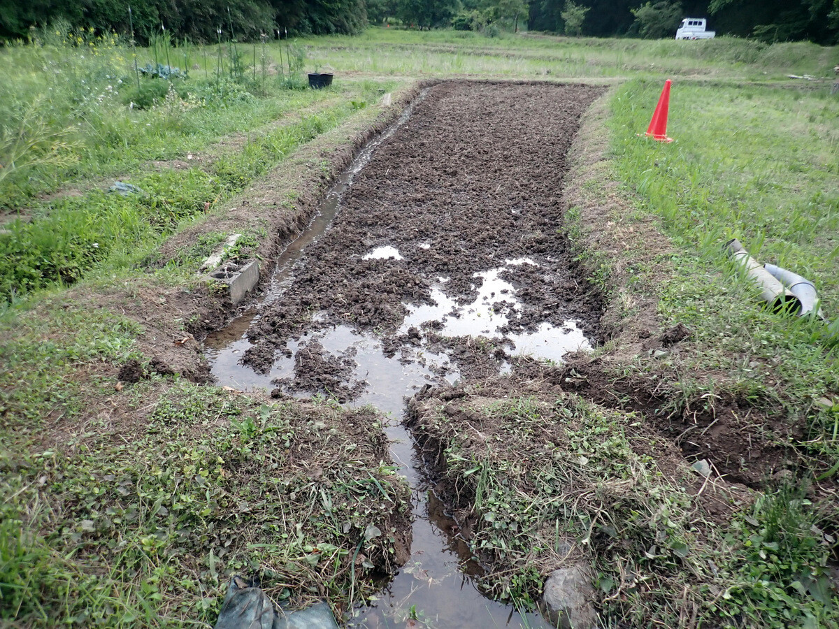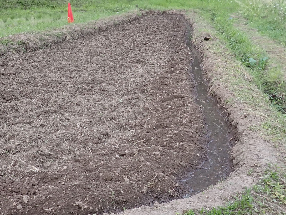 田んぼの畦際に水を廻したら、田んぼの土をドロドロに捏ねて畦塗りをします。