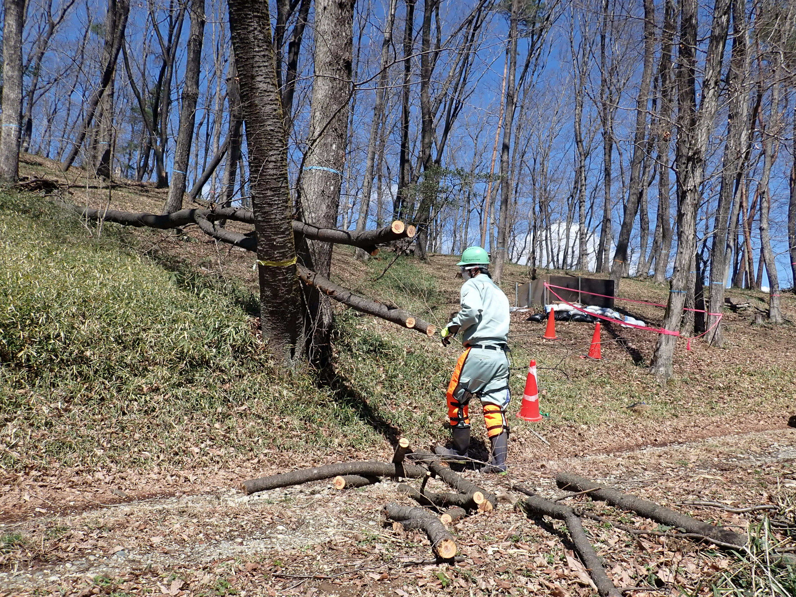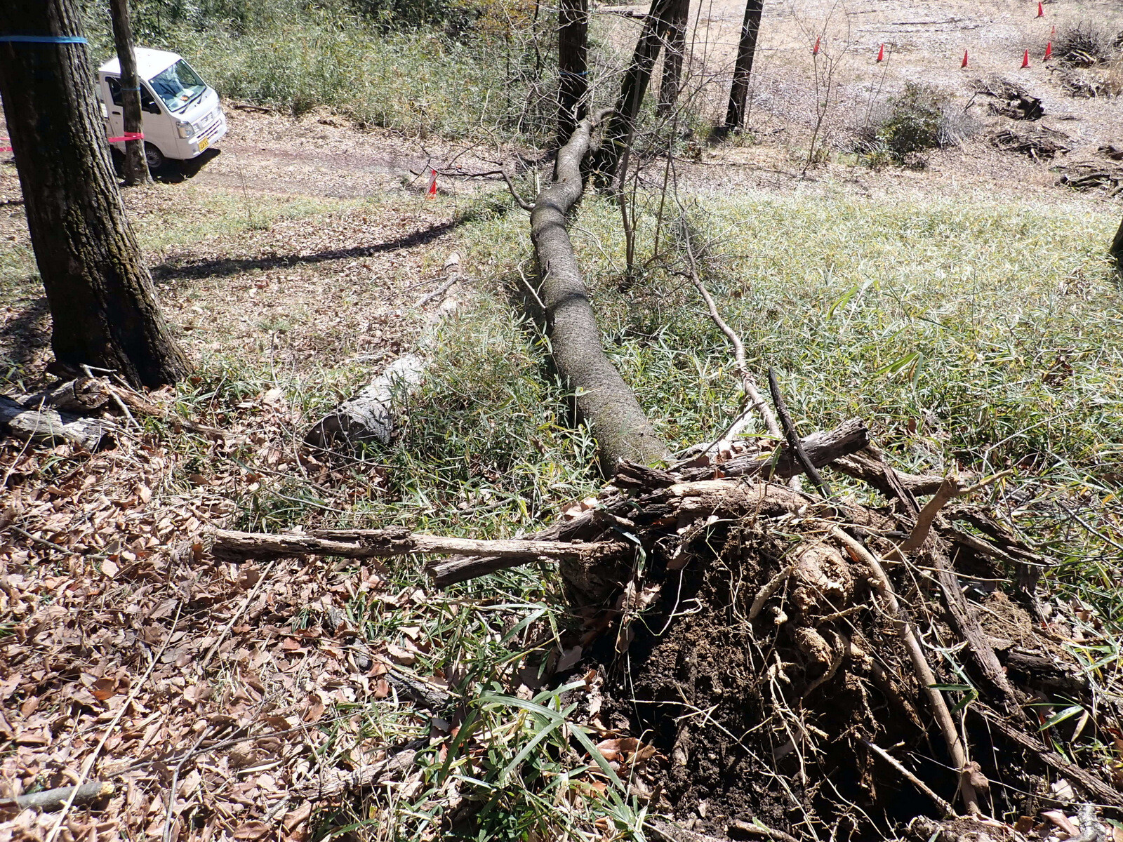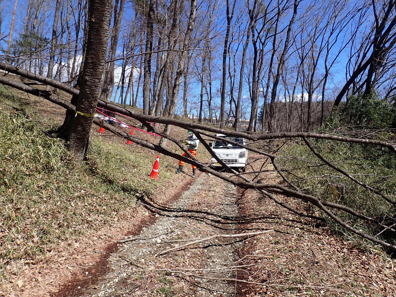 市民の森の作業道に倒伏したヤマザクラがありましたが、公園のパトロールにきていた松下さんがチェンソーでクルマが通れるようにしてくれました。ありがとうございました。