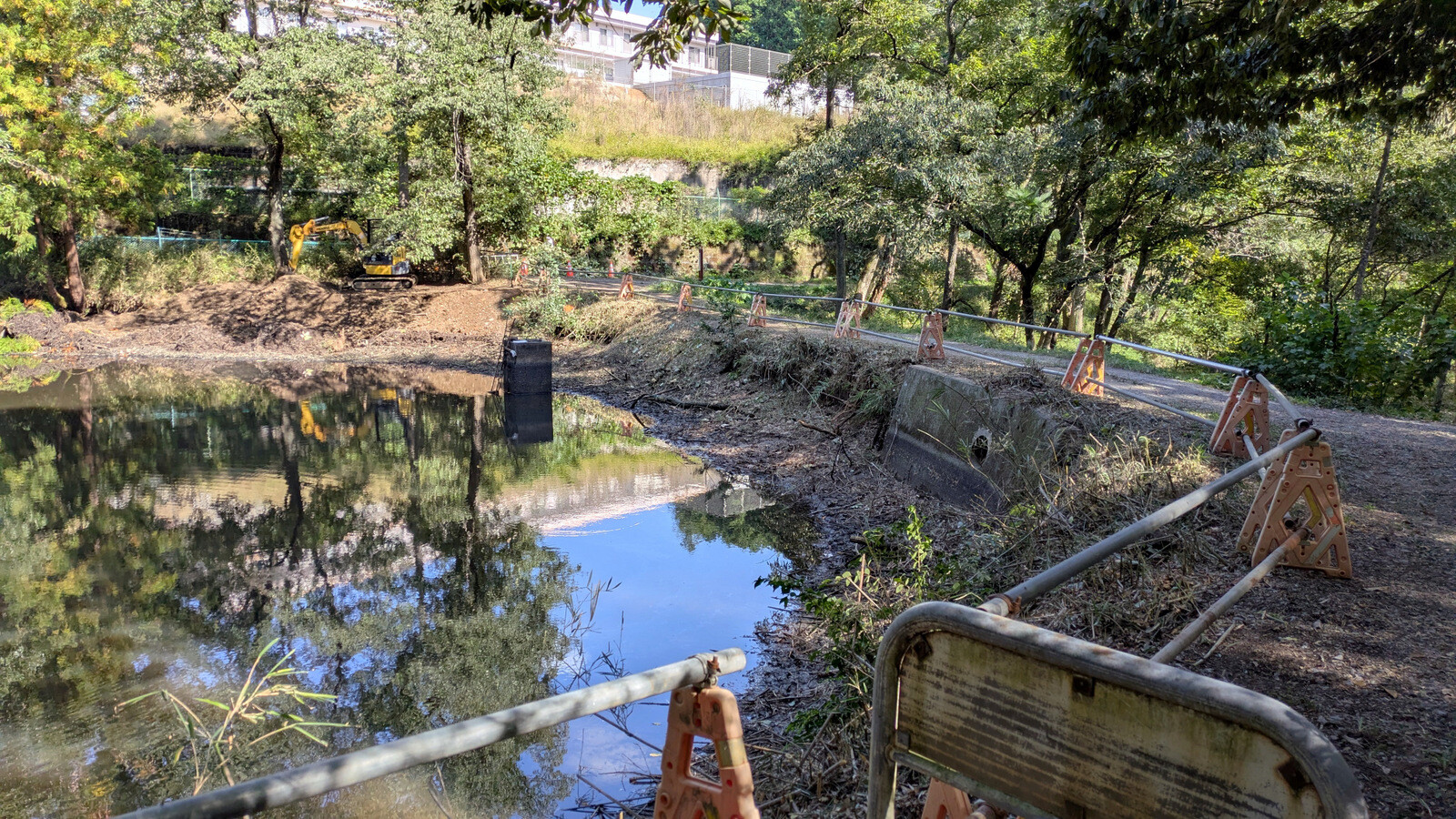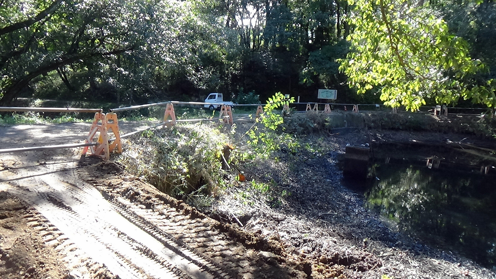 入山沼堰堤の改修工事は今日は休工。排水されて岸辺では底が見えています。