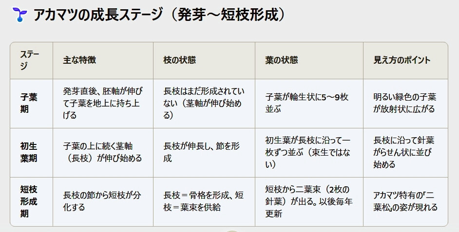 アカマツの発芽から短枝形成まで、Copilotを使ってまとめてみました。