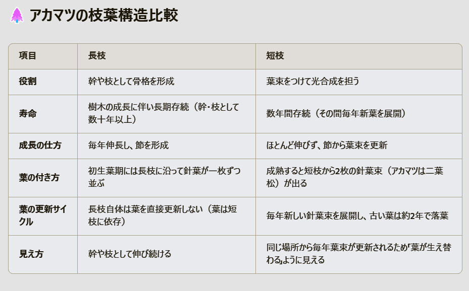 長枝・短枝(役割・寿命・成長の仕方・葉の付き方・葉の更新サイクル・見え方)
