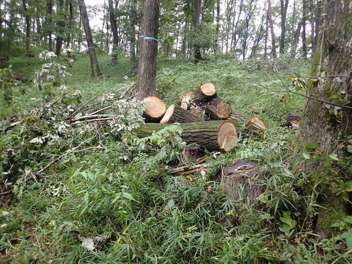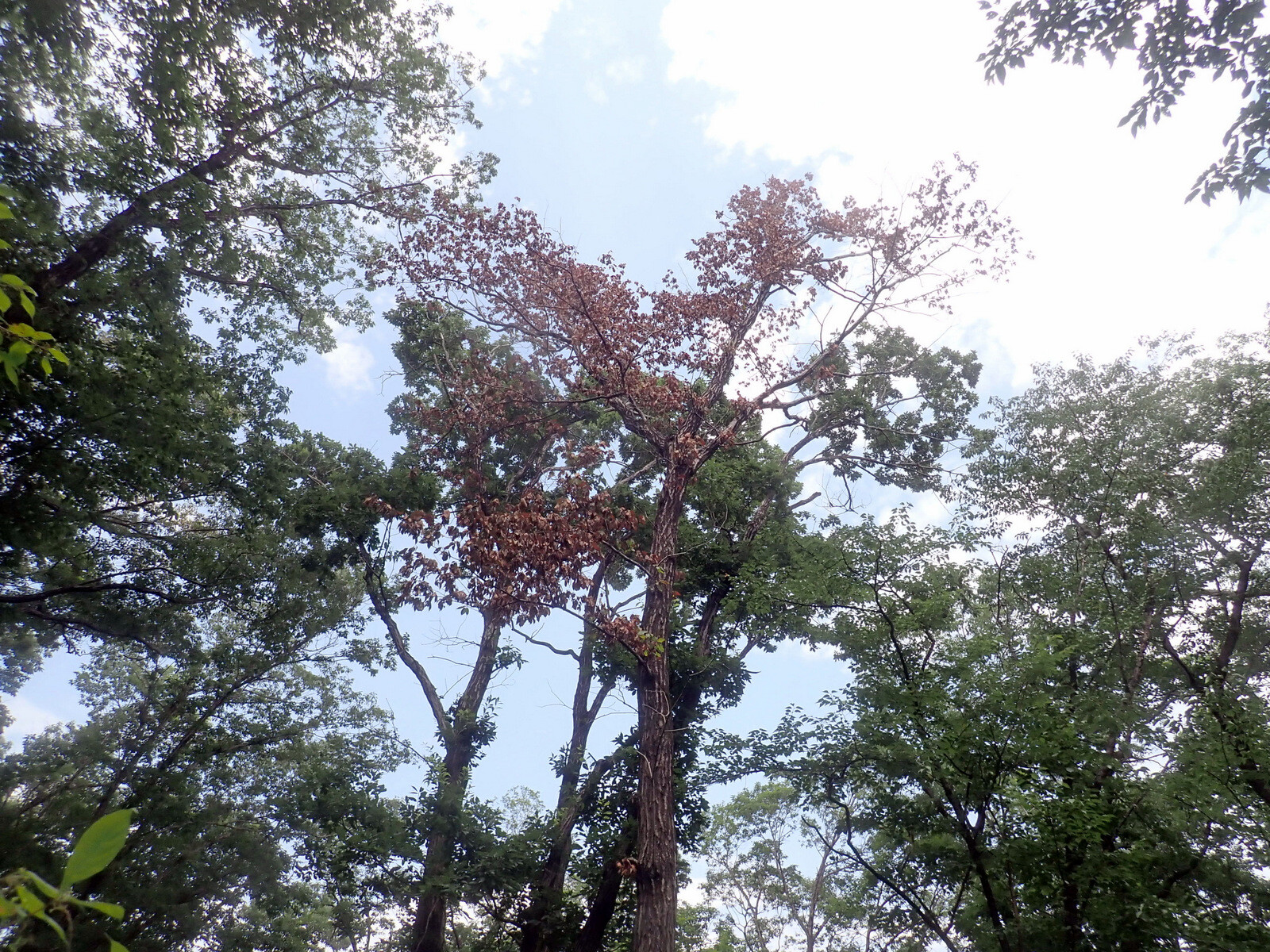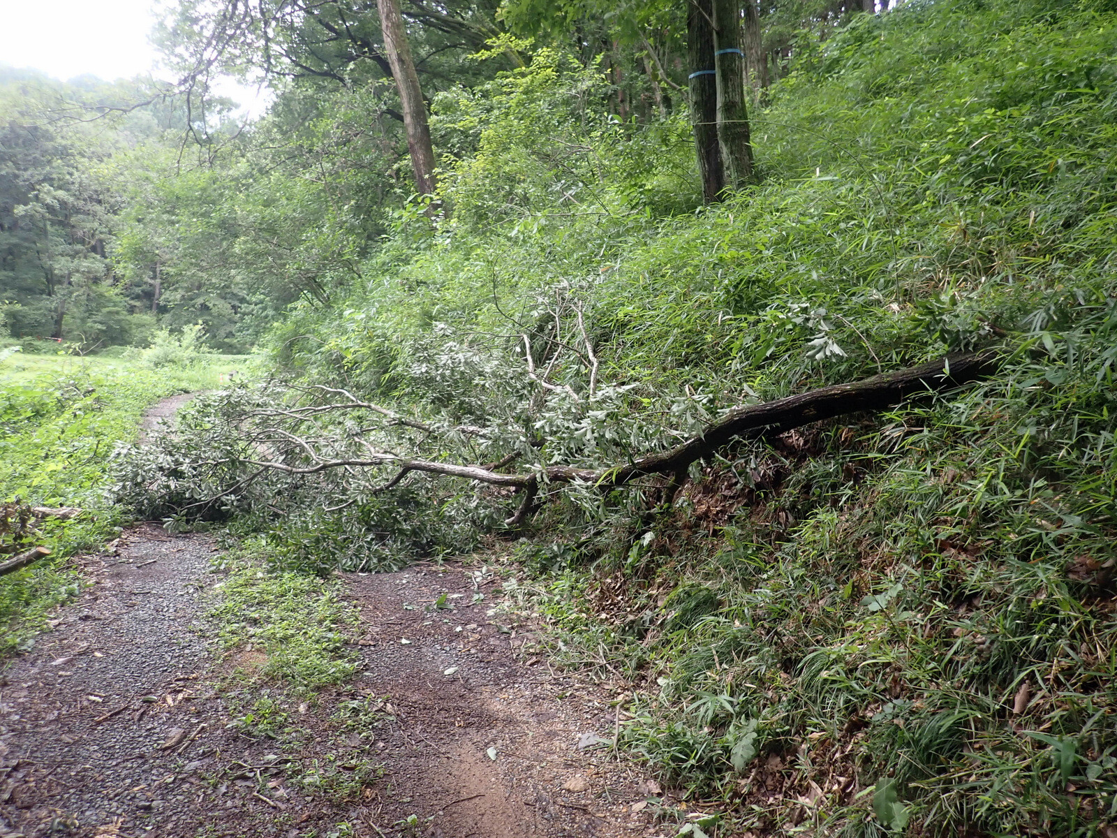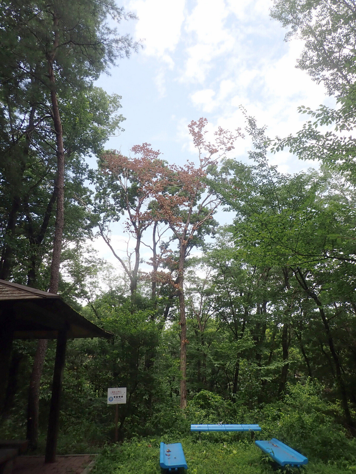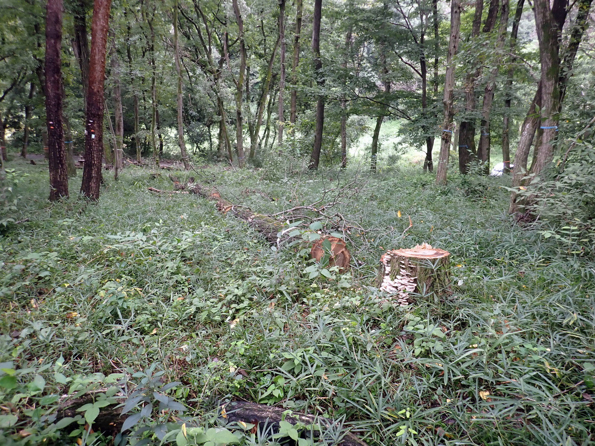 市民の森の樹木は暑さで弱っています。枯死木、衰弱木を点検し、緑のテープを巻きました。