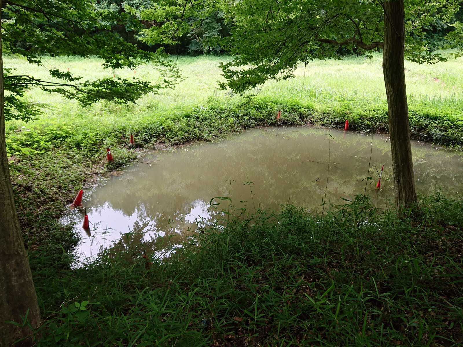 猛暑になりそうなので炎天下の作業は避けて、市民の森の林内、尾根の道の四阿付近で、4月11日に植えたヤマザクラ、ウワミズザクラの苗木の刈出しや夏季の下刈りエリアで何を刈り残すかなど検討しました。