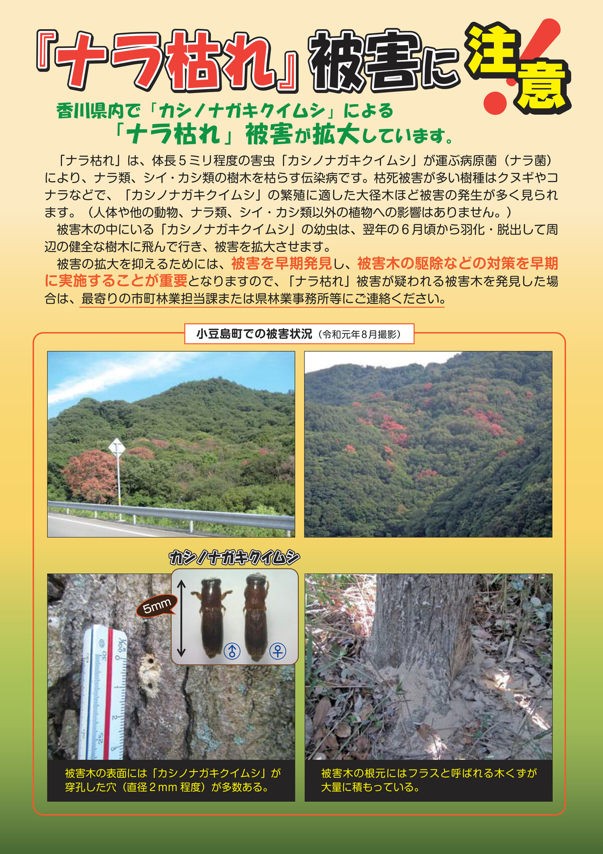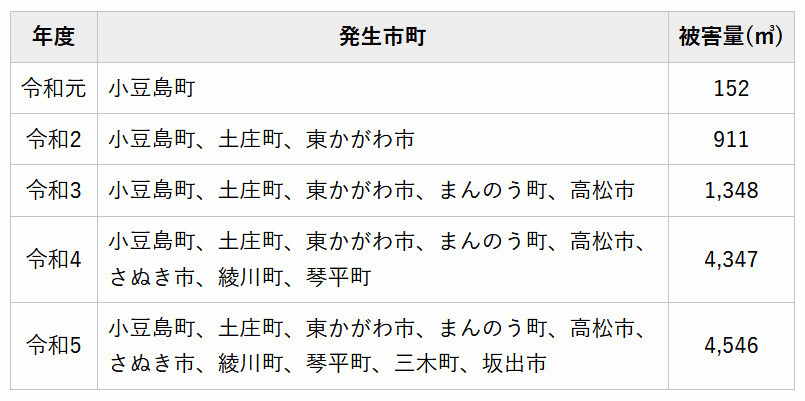 香川県では2019年、小豆島町においてナラ枯れか確認され、その後23年度までに4市6町に被害が拡大しています(香川県HP>「ナラ枯れ」の発生について)。小豆島の土庄町[とのしょうちょう]と対岸の岡山県玉野市までが約10㎞、四国の香川県高松市までが約3㎞です。
