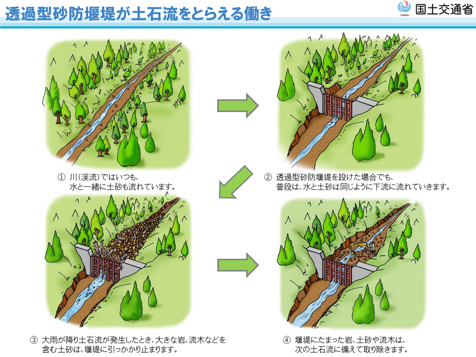 土砂災害においては、豪雨や地震により山が崩れると土砂と共に流木が下流へ流れ出ることで家屋等への被害を増大させる事例が多くあります。その対策として、土砂・流木捕捉効果の高い透過型砂防堰堤の整備が重要になります。砂防堰堤は大きく不透過型と透過型に分けられ、共に流木を捕捉する機能を持ちます。特に透過型は水が貯まらずに流木と土砂が一体のまま捕捉出来るため、流木を効率よく捕捉出来ます。そのため、土石流のおそれのある箇所では、透過型砂防堰堤の整備を推進していきます。一方、恒常的に土砂が流れ出るような箇所では、不透過型砂防堰堤により、新たな斜面の崩壊や土砂の流出を防ぐ必要があります。あれこれ