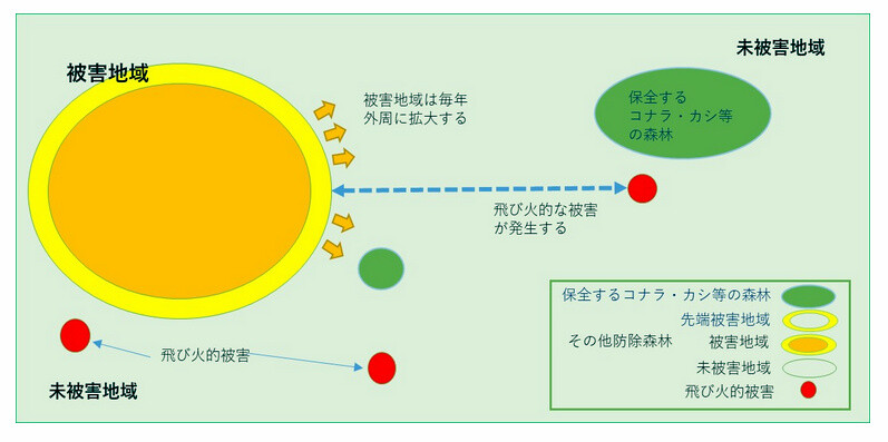 ・県内の森林を被害地・未被害地・保全するコナラ・カシ等の森林等に区分。