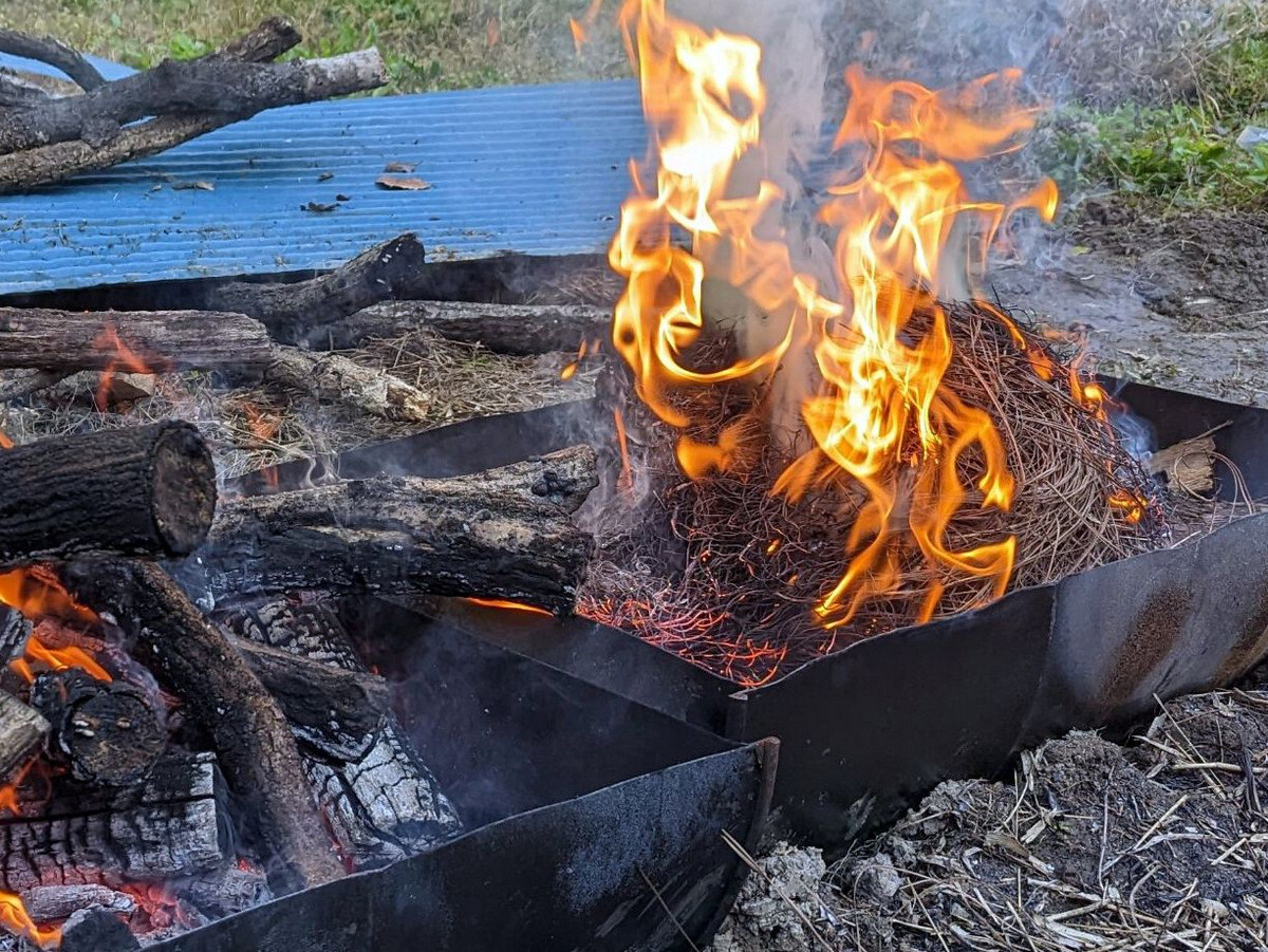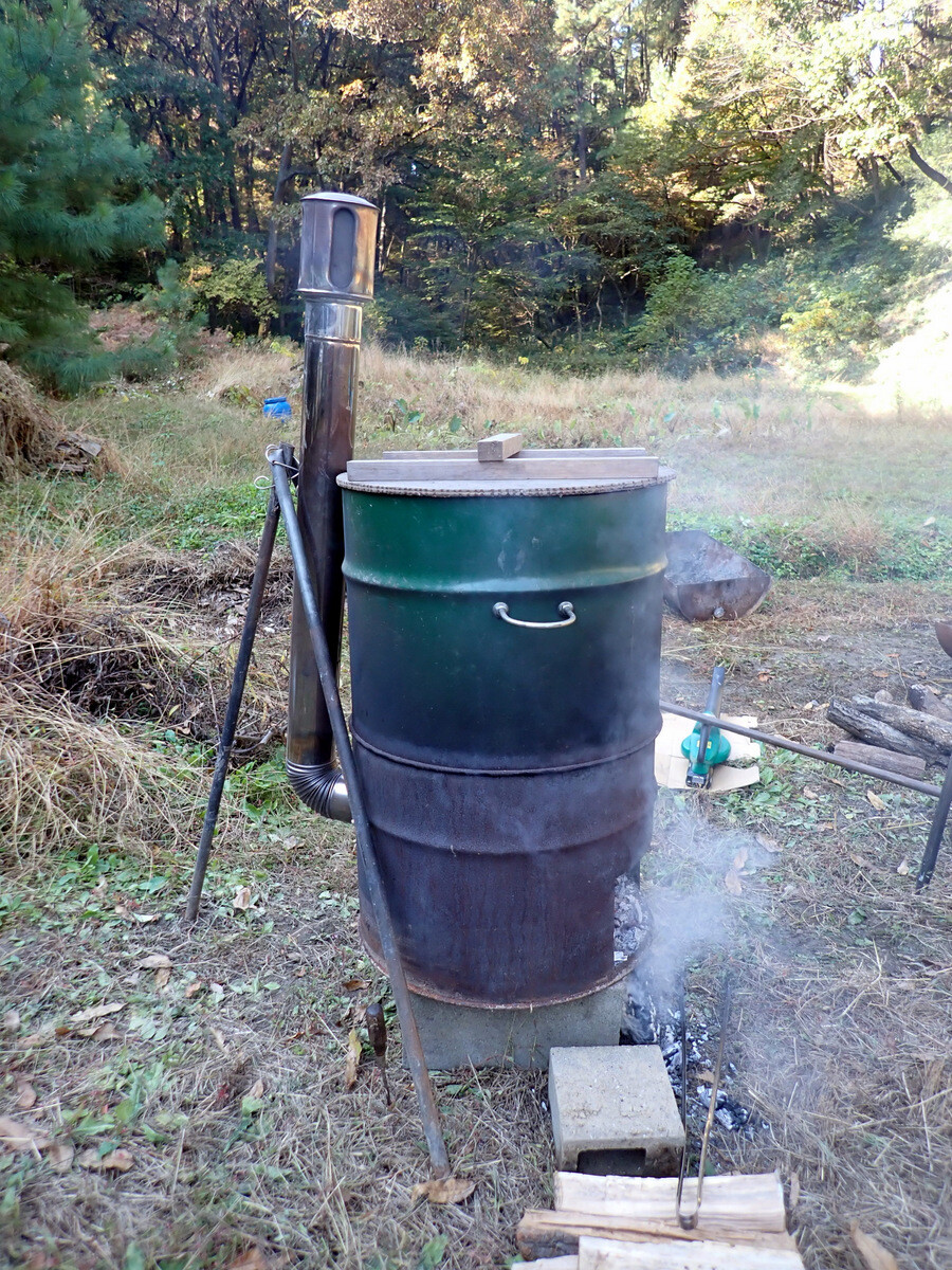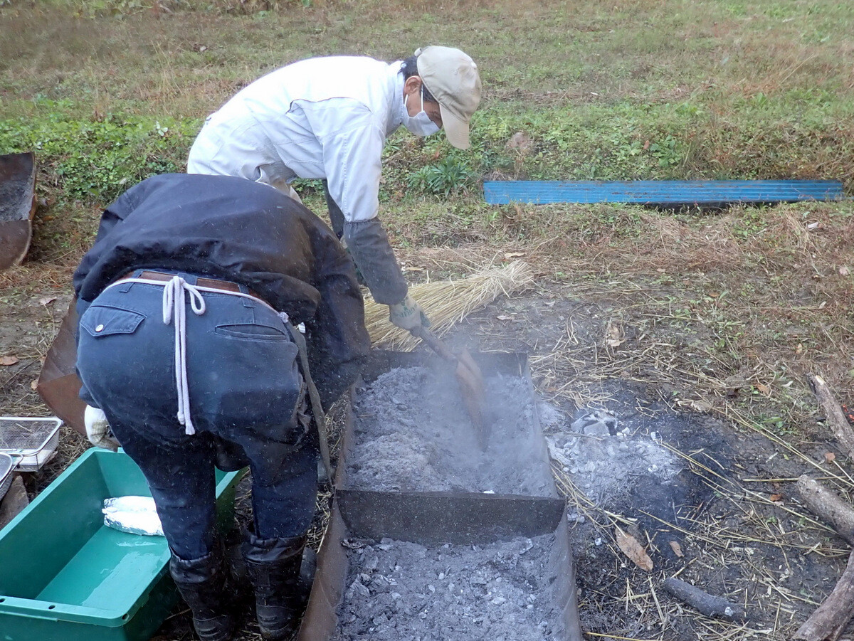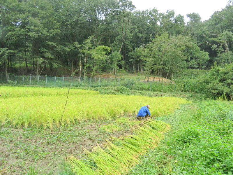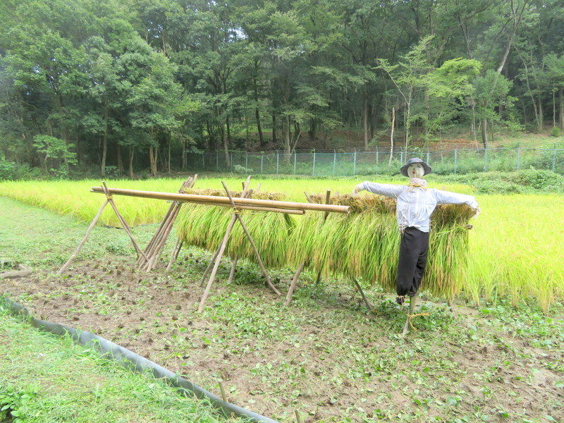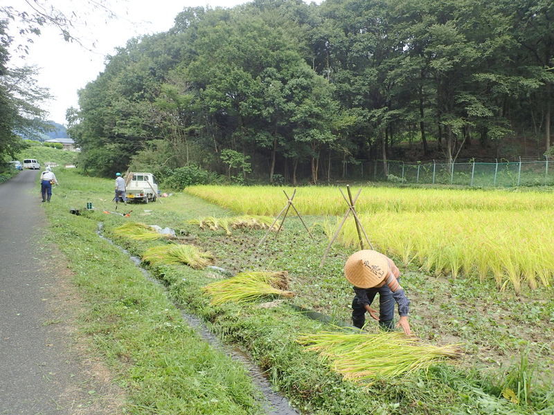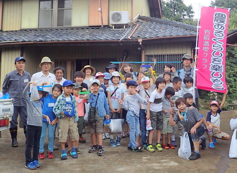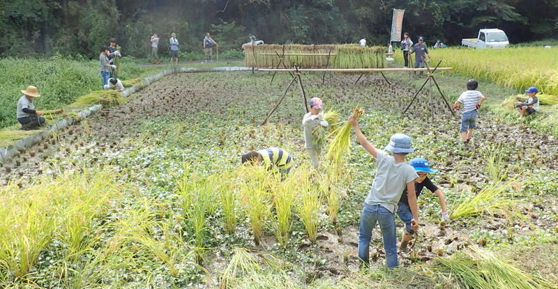 昨日からの雨降りで田んぼが濡れているため稲刈りを後回しにして、午前中は昨日仕掛けていた2つの四つ手網にかかった100匹以上のアメリカザリガニの観察。6月4日の田植時に植えたサツマイモを掘り、焚き火で焼き芋をしました。午後は下の田んぼのコシヒカリをノコギリ鎌で刈ってハンデに掛け、その後、田んぼのまわりやビオトープ池で遊びました。