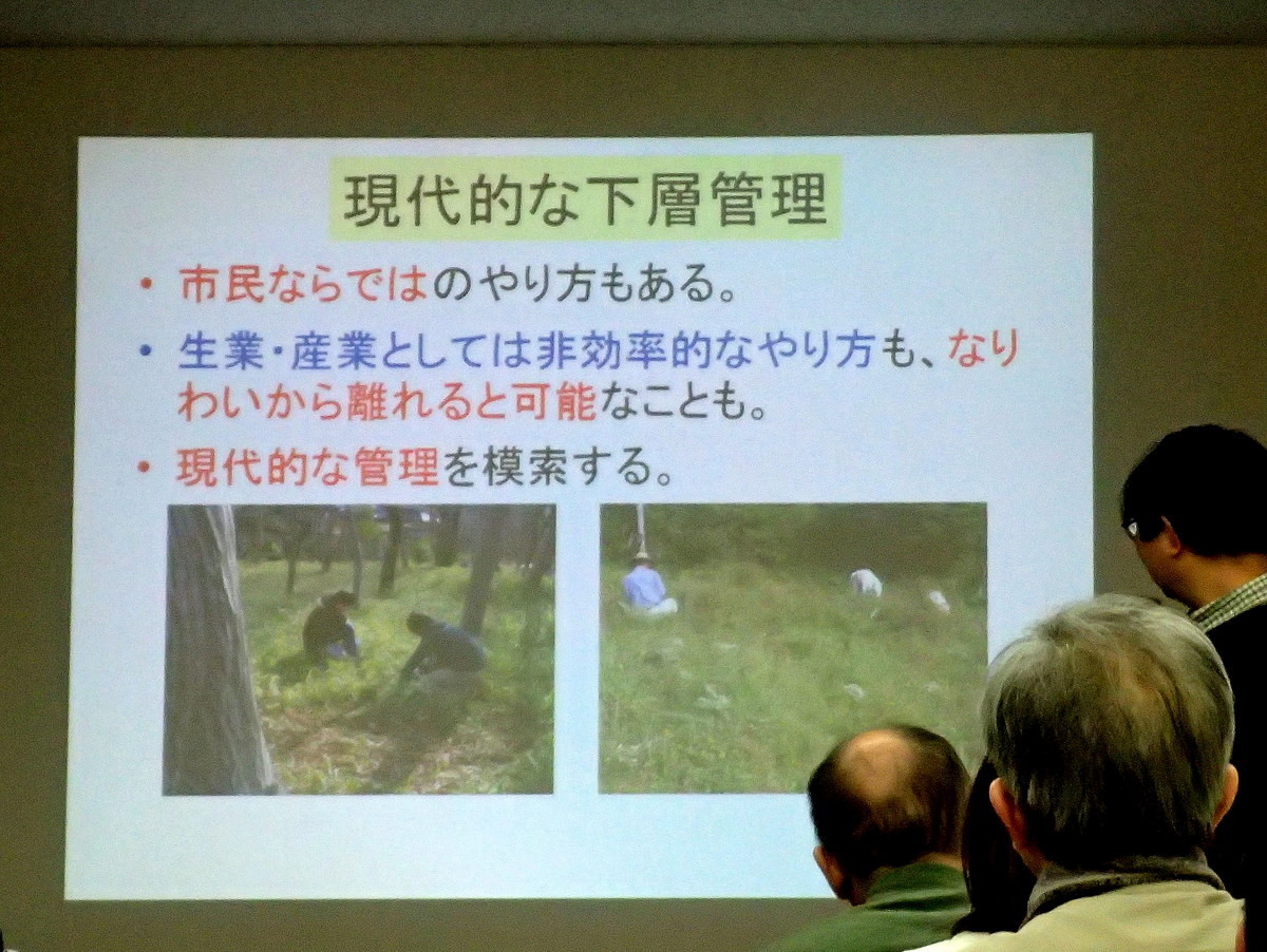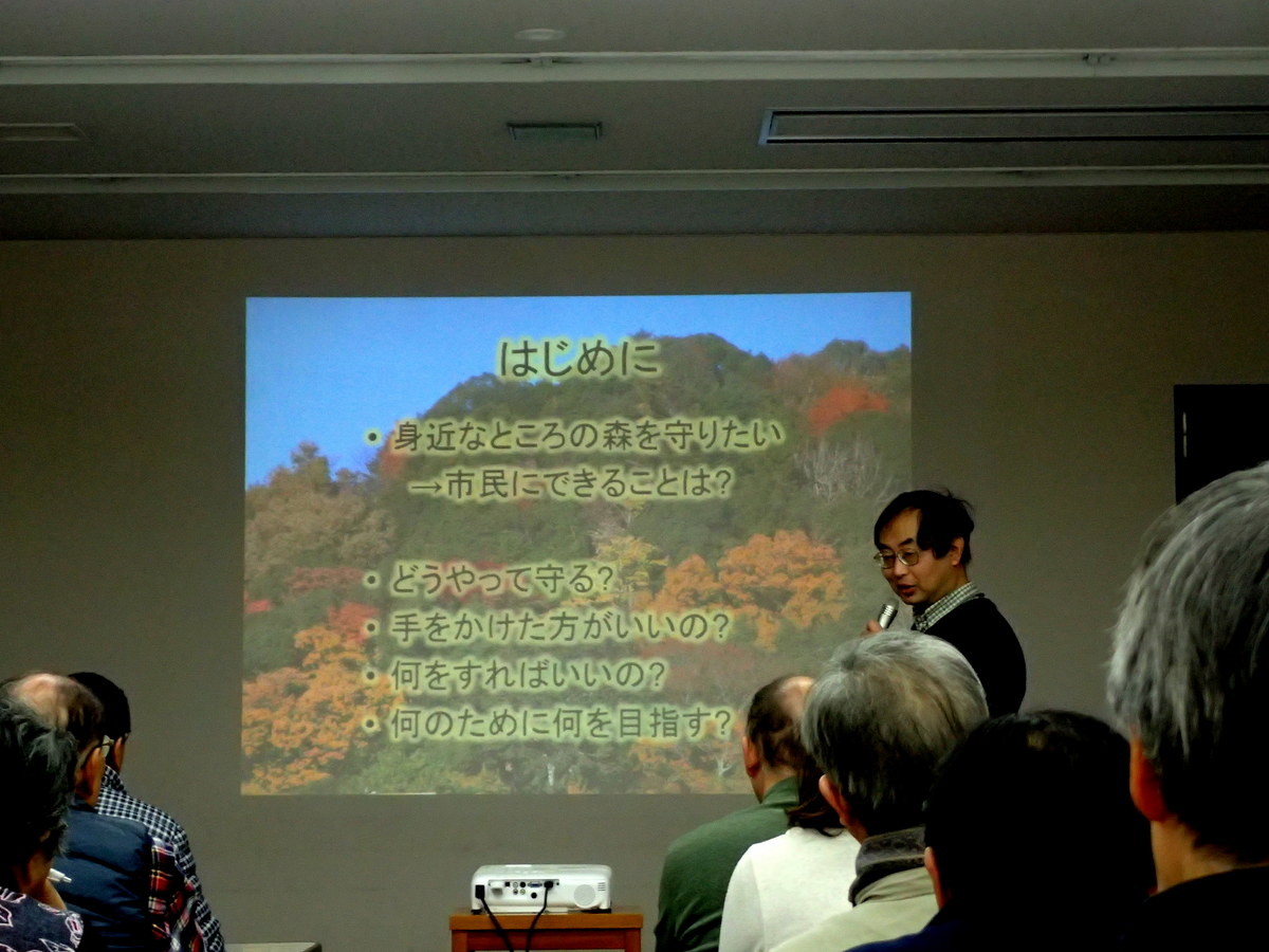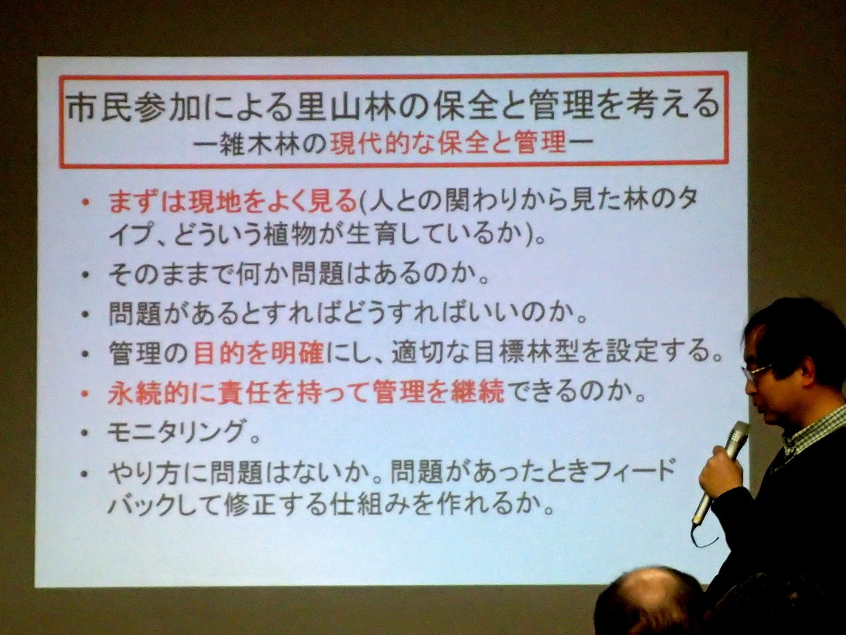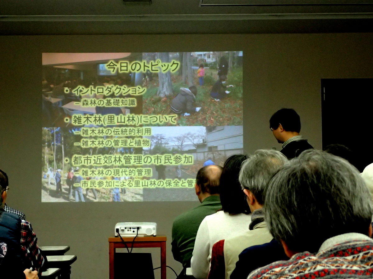 ・第2回2月18日(日曜日)『市民参加による里山林の保全・管理を考える』(島田和則さん、森林総合研究所多摩森林科学園主任研究員)市民参加による都市近郊の里山林の保全活動の方法や実施可能な取組内容、その効果について。