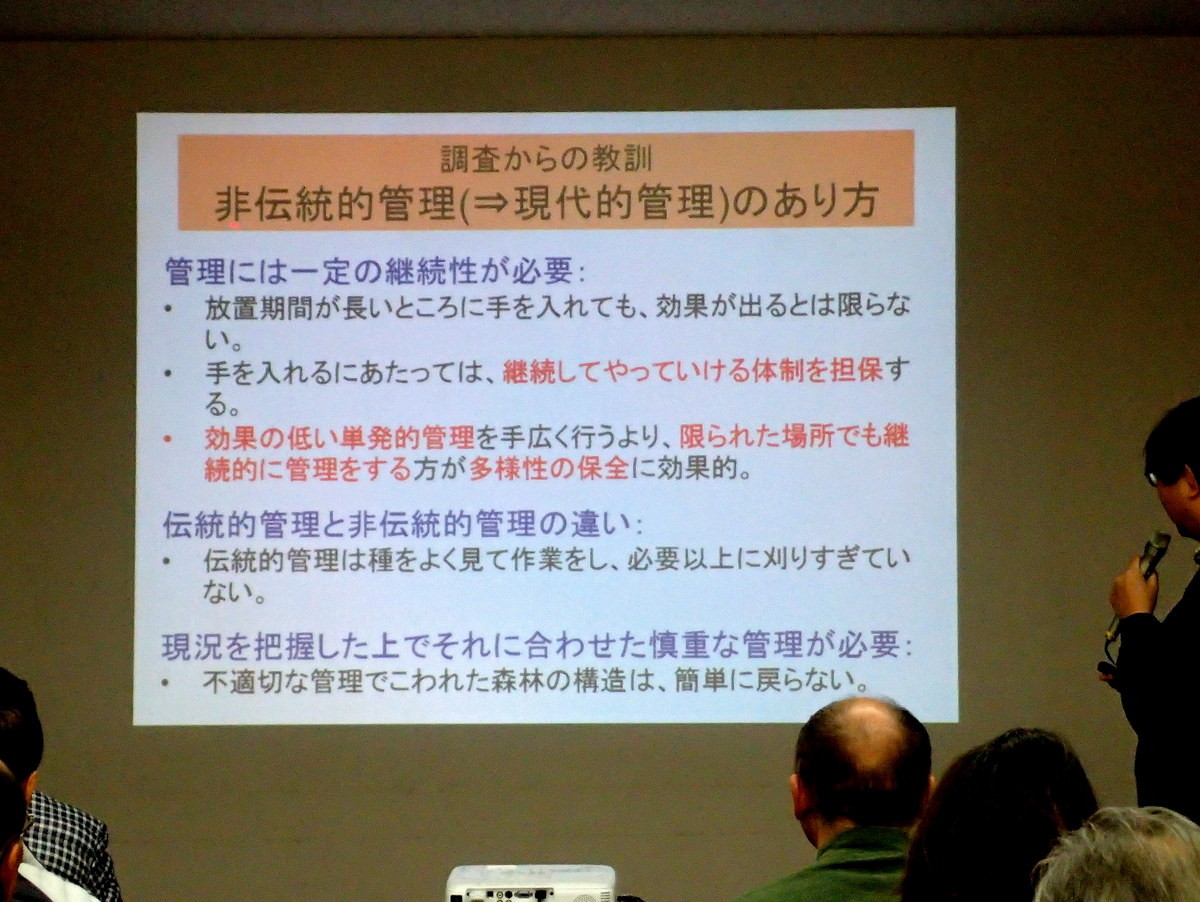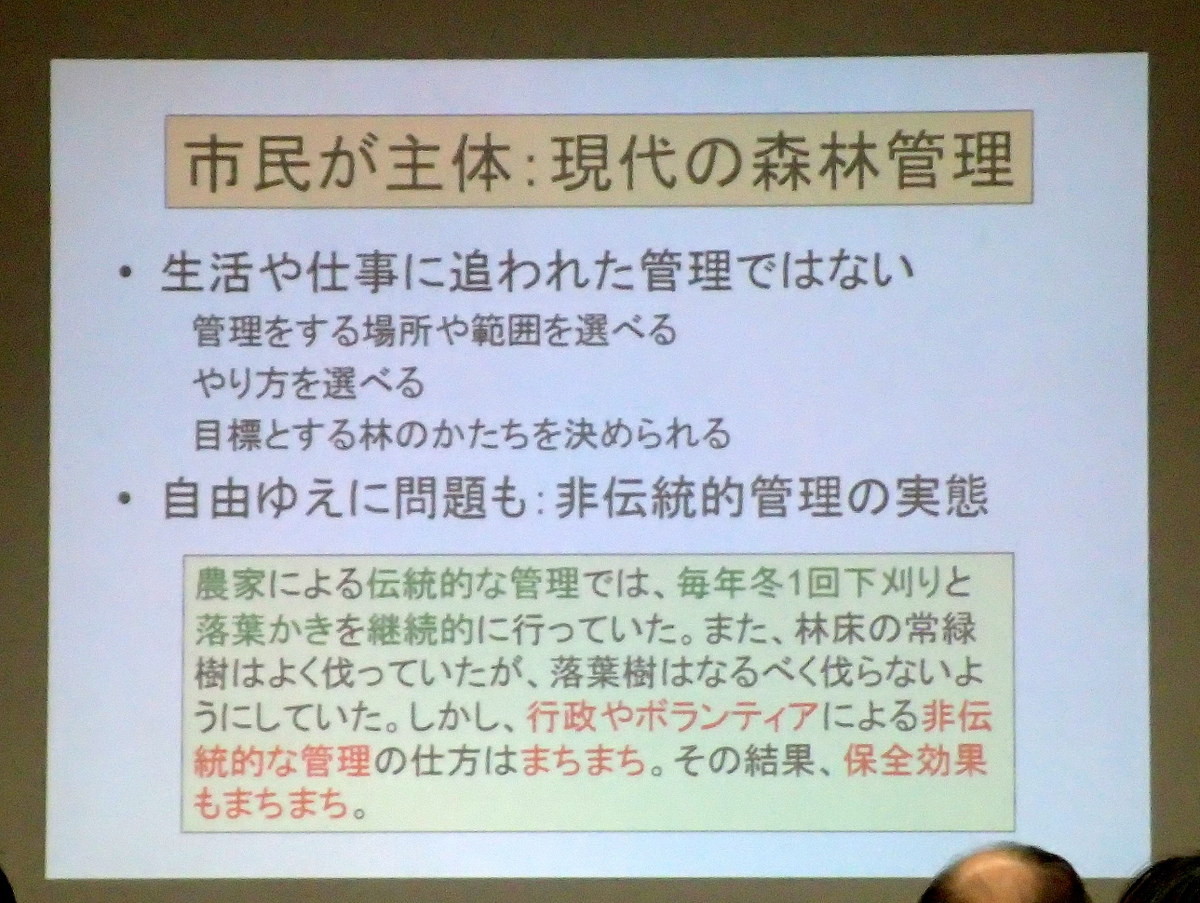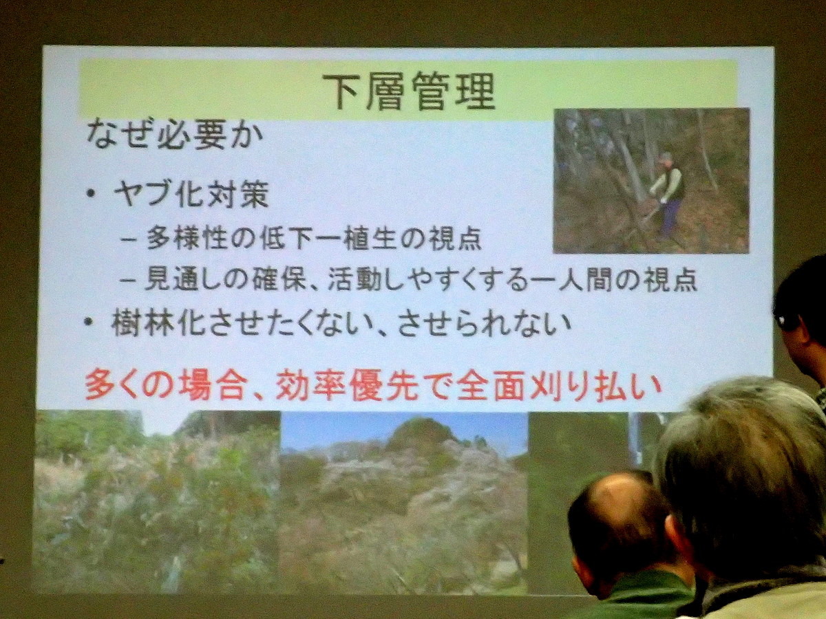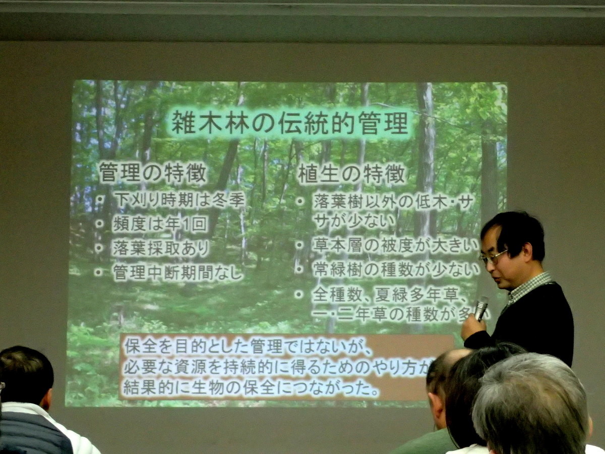・第2回2月18日(日曜日)『市民参加による里山林の保全・管理を考える』(島田和則さん、森林総合研究所多摩森林科学園主任研究員)市民参加による都市近郊の里山林の保全活動の方法や実施可能な取組内容、その効果について。