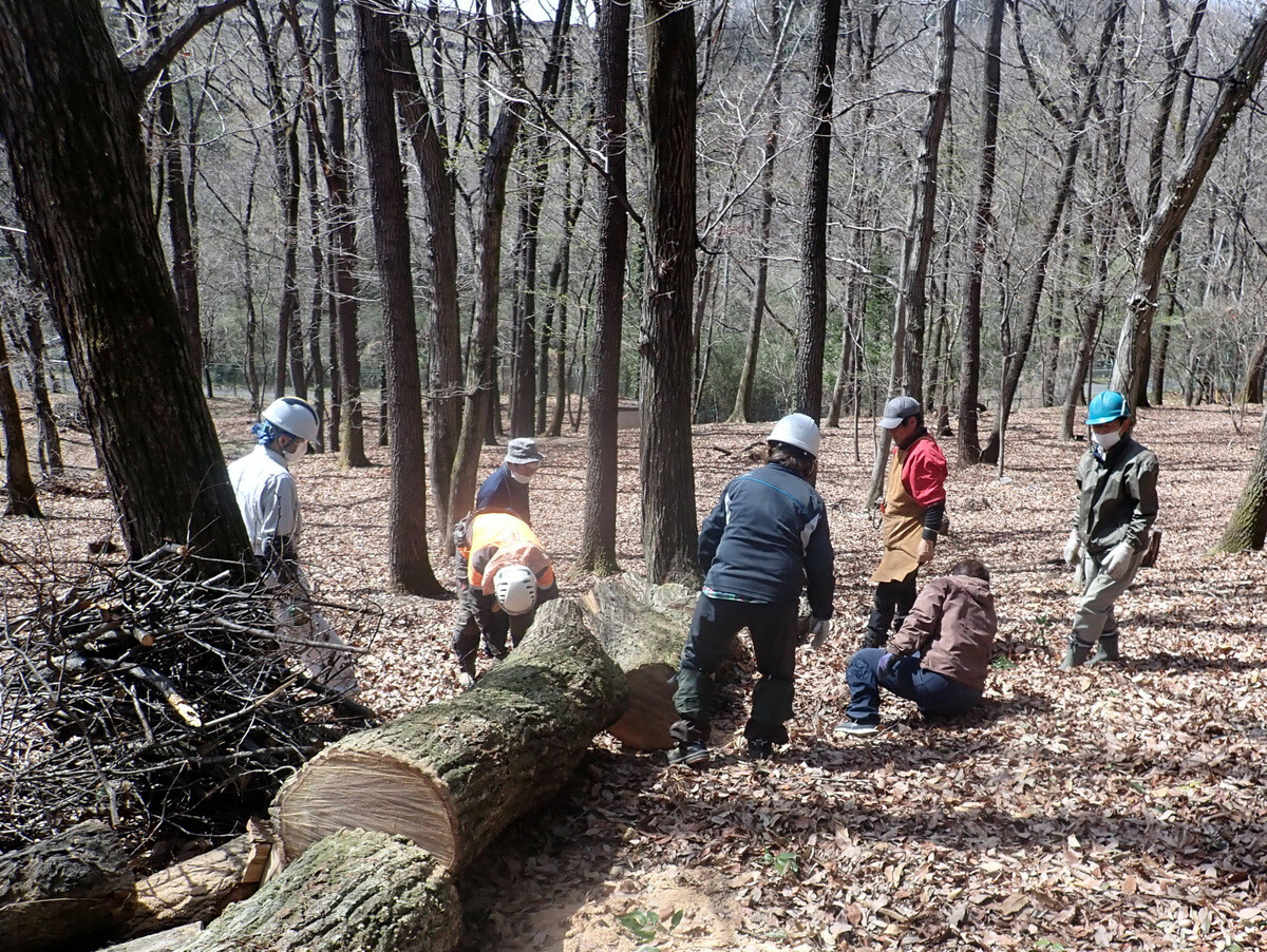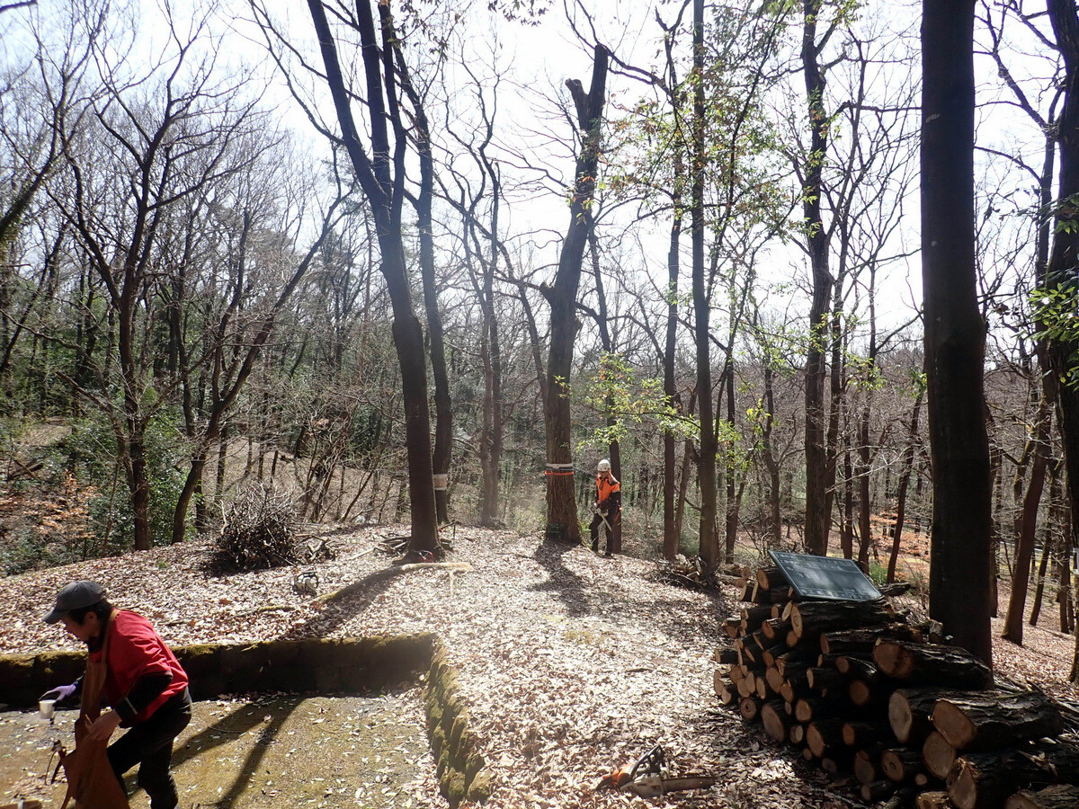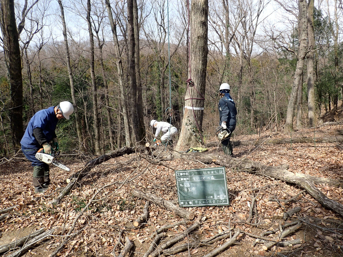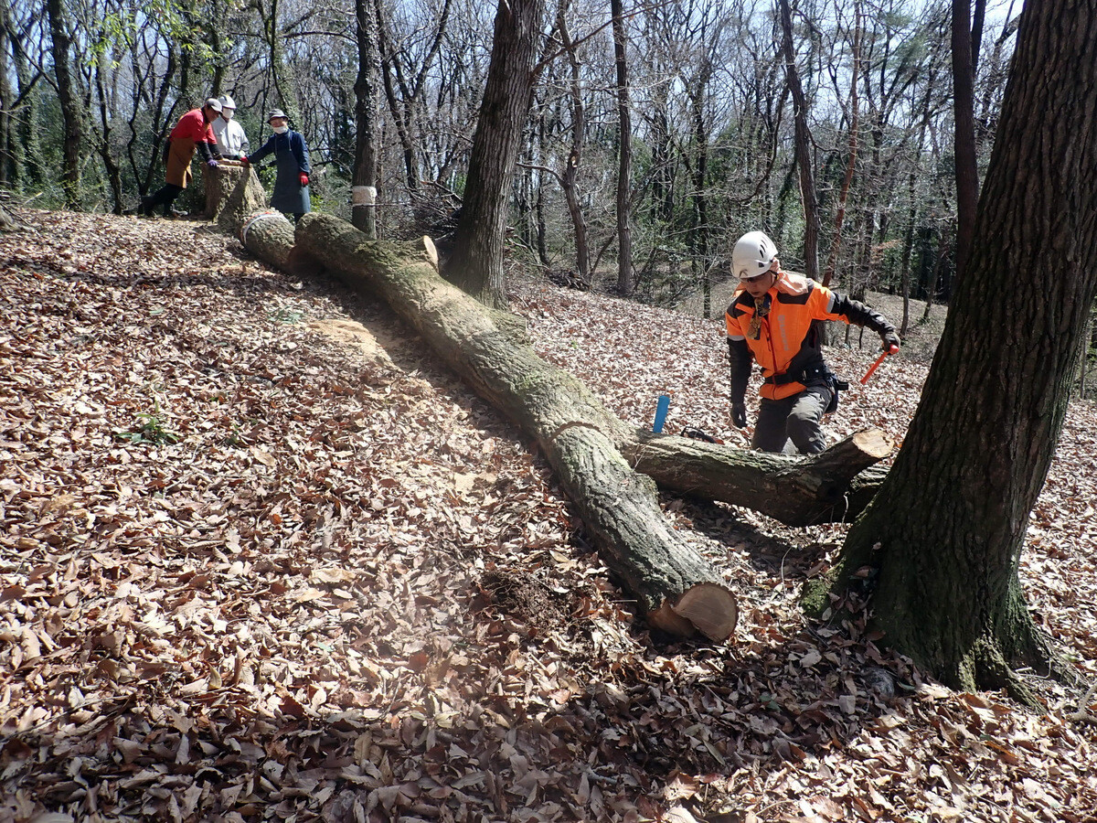 市民の森保全クラブ追加作業日。参加者は新井さん、江原さん、金子さん、鳥取さん、細川さん、渡部さん、Hikizineと新倉さんの8名でした。高坂丘陵地区ちご沢の森でナラ枯れ枯死木(№2)を伐採しました。切株の長辺73㎝の大きなコナラでした。